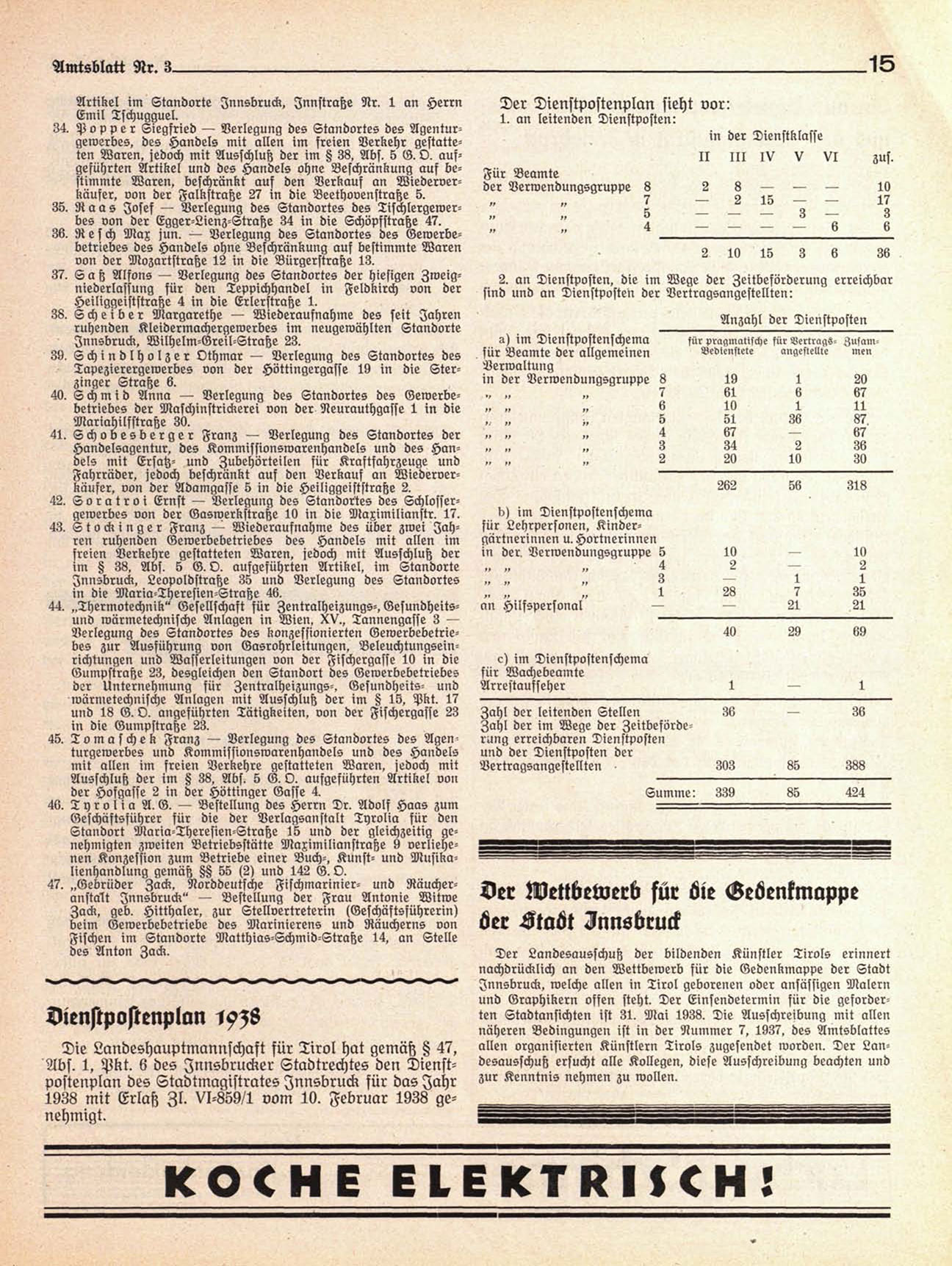 34. P o p p e r Siegfried — Verlegung des Standortes des Agenturgewerbes, des Handels mit allen i m freien Verkehr gestatteten Waren, jedoch mit Ausschluß der im § 38. Abs. 5 G. O. aufgeführten A r t i k e l und des Handels ohne Beschränkung auf bestimmte Waren, beschränkt auf den Verkauf an Wiederverkäufer, von der Falkstraße 27 i n die Beethovenstraße 5.