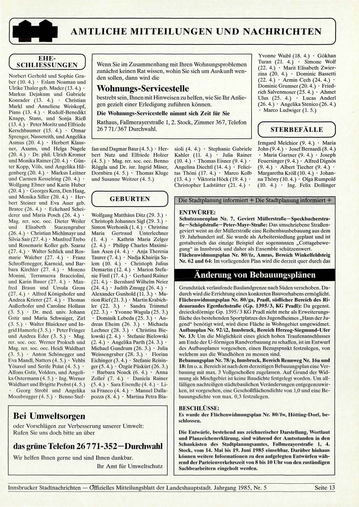 Innsbrucker Stadtnachrichten — Offizielles Mitteilungsblatt der Landeshauptstadt. Jahrgang 1985, Nr. 5