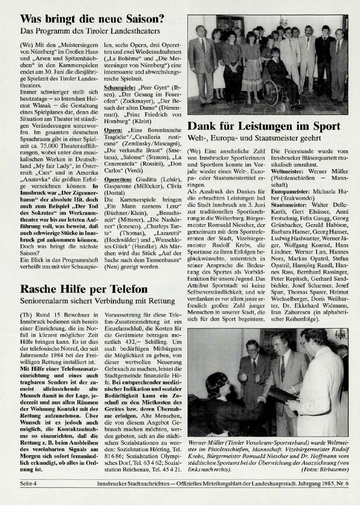 Innsbrucker Stadtnachrichten — Offizielles Mitteilungsblatt der Landeshauptstadt. Jahrgang 1985, Nr. 6