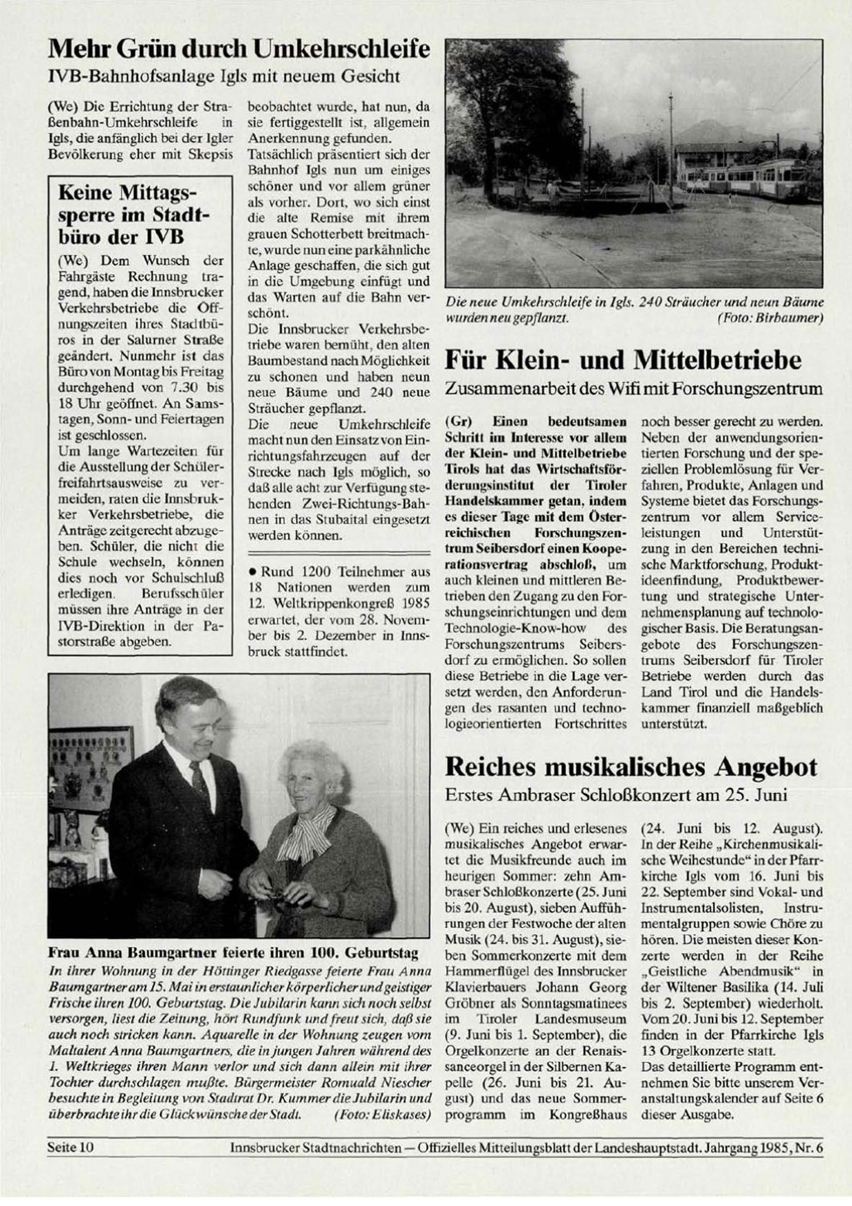 Innsbrucker Stadtnachrichten — Offizielles Mitteilungsblatt der Landeshauptstadt. Jahrgang 1985, Nr. 6