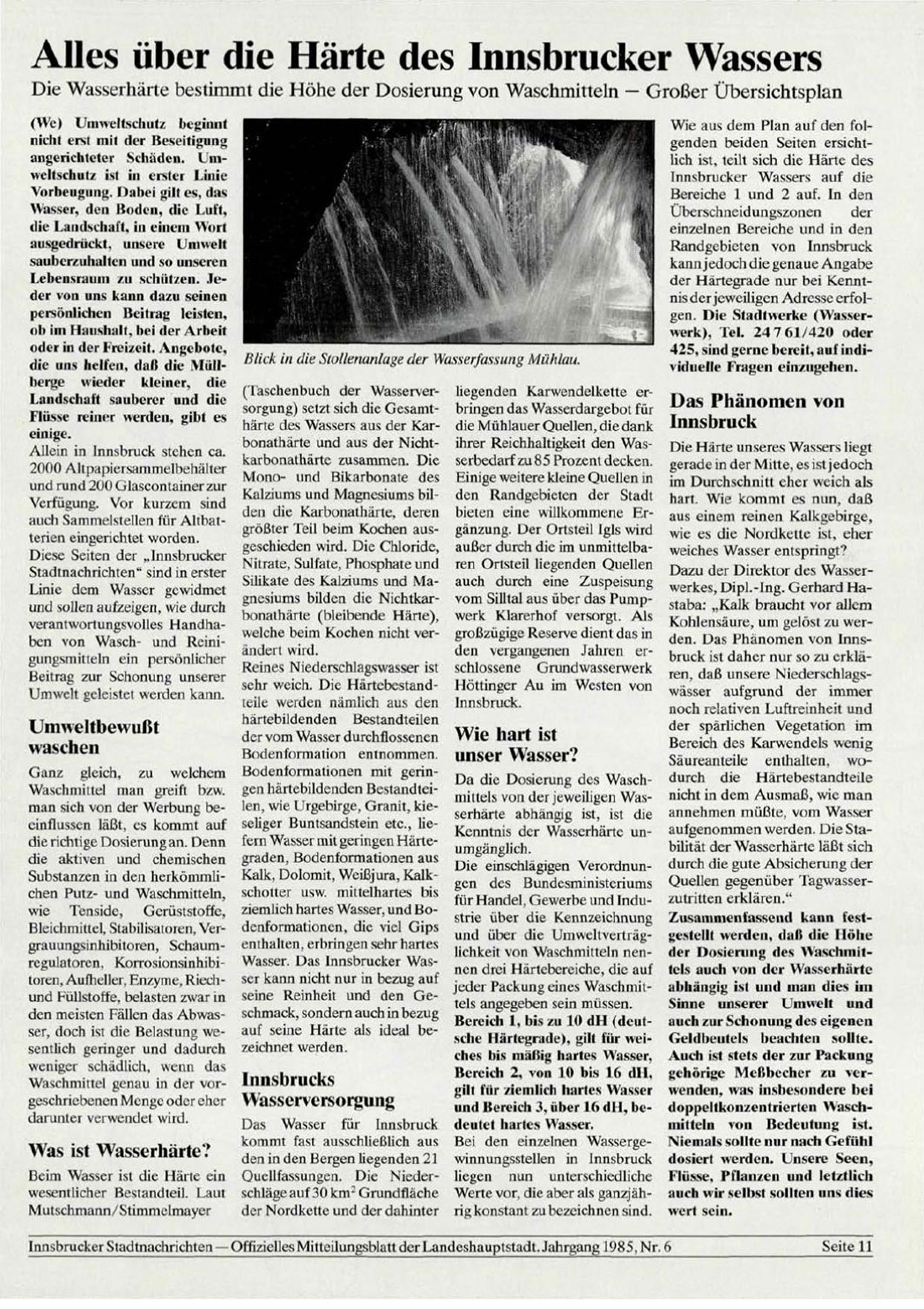 Die Härte unseres Wassers liegt gerade in der Mitte, es ist jedoch im Durchschnitt cher weich als hart. Wie kommt es nun, daß aus einem reinen Kalkgebirge, wie es die Nordkette ist, cher weiches Wasser entspringt? Dazu der Direktor des Wasserwerkes, Dipl.-Ing. Gerhard Hastaba: „Kalk braucht vor allem Kohlensäure, um gelöst zu werden. Das Phänomen von Innsbruck ist daher nur
