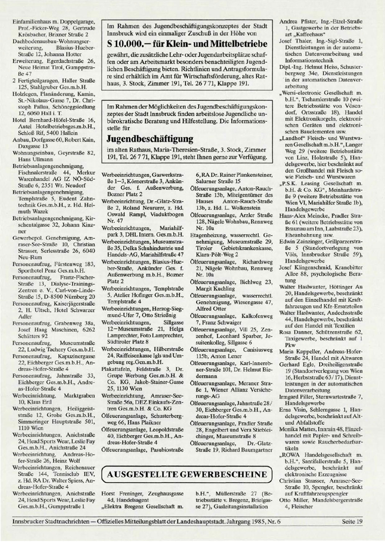 Walter Haslwanter, Höttinger Au 20, Handelsgewerbe, beschränkt auf den Einzelhandel mit Kraftfahrzeugen und Kfz-Ersatzteilen Walter Haslwanter, Andechsstraße 44, Handelsgewerbe, beschränkt auf den Handel mit Textilien Rosa Danner, Schützenstraße 62, Taxigewerbe, beschränkt auf 1 Pkw
