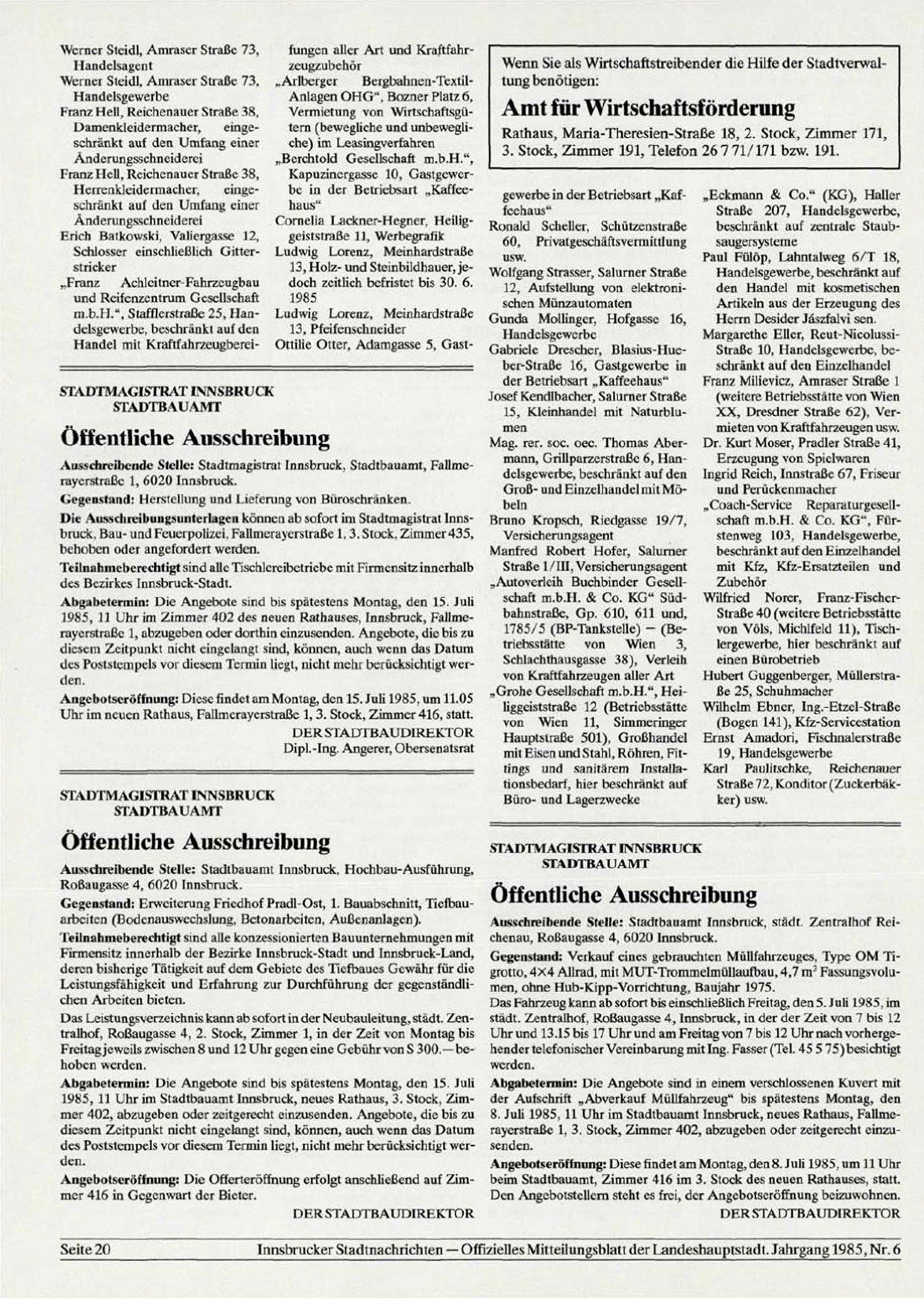 Wilfricd Norer, Franz-FischerStraße 40 (weitere Betriebsstätte von Völs, Michlfeld 11), Tischlergewerbe, hier beschränkt auf einen Bürobetrieb Hubert Guggenberger, MüllerstraBe 25, Schuhmacher Wilhelm Ebner, Ing.-Etzel-Straße (Bogen 141), Kiz-Servicestation Ernst Amadori, Fischnalerstraße 19, Handelsgewerbe Karl Paulitschke, Reichenauer Straße 72, Konditor (Zuckerbäkker)