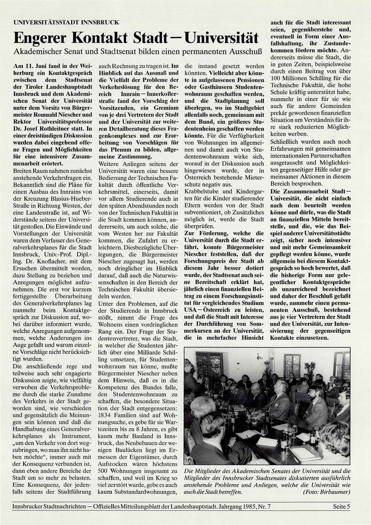 Innsbrucker Stadtnachrichten — Offizielles Mitteilungsblatt der Landeshauptstadt. Jahrgang 1985, Nr. 7