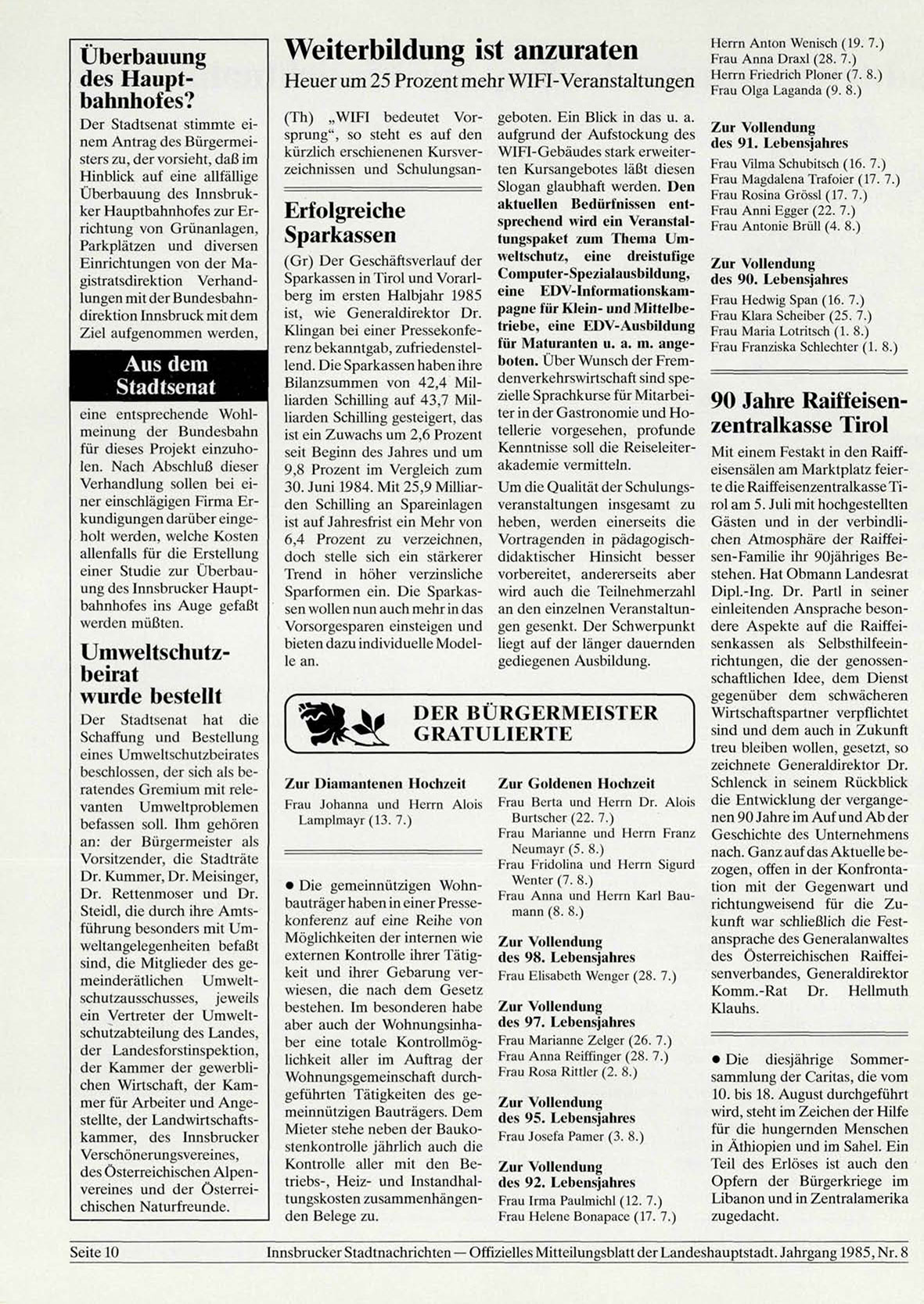 Innsbrucker Stadtnachrichten — Offizielles Mitteilungsblatt der Landeshauptstadt. Jahrgang 1985, Nr. 8