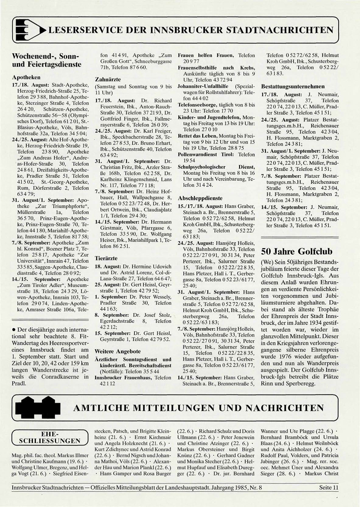 Innsbrucker Stadtnachrichten — Offizielles Mitteilungsblatt der Landeshauptstadt. Jahrgang 1985, Nr. 8