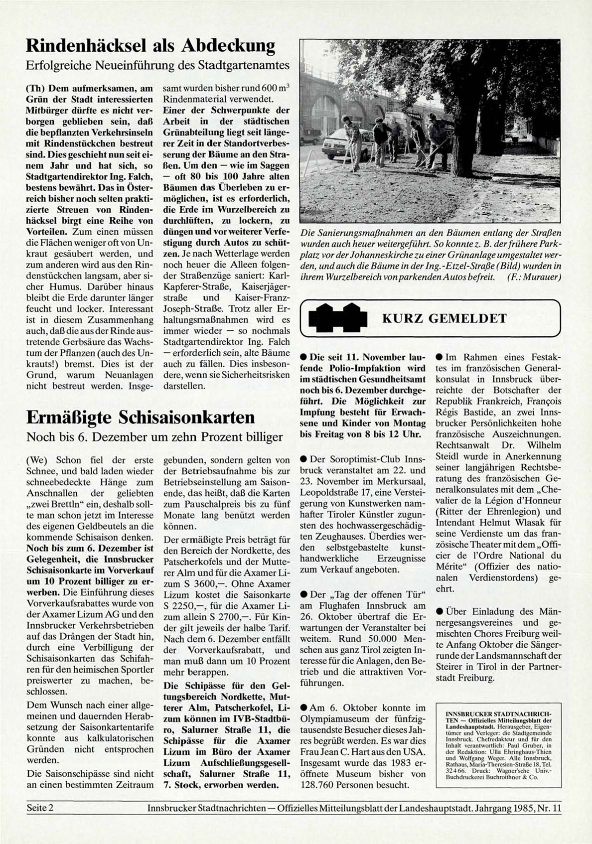 Innsbrucker Stadtnachrichten — Offizielles Mitteilungsblatt der Landeshauptstadt. Jahrgang 1985, Nr. 11