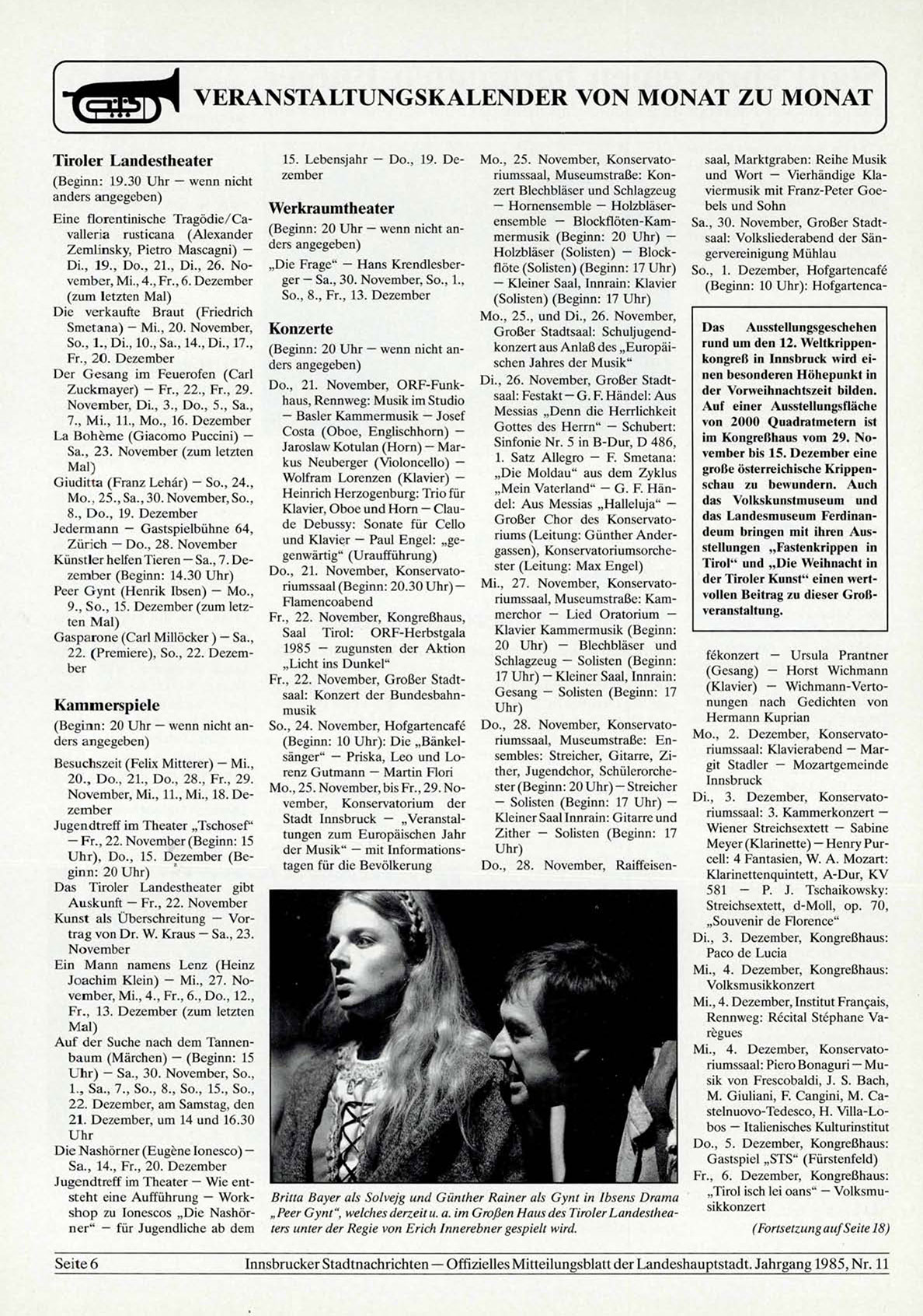Jugendtreff im Theater — Wie entsteht eine Aufführung — Work- Britta Bayer als Solvejg und Günther Rainer als Gynt in Ibsens Drama „Tirol isch lei oans" — Volksmushop zu Ionescos „Die Nashör- „Peer Gynt", welches derzeit u. a. im Großen Haus des Tiroler Landesthea-sikkonzert