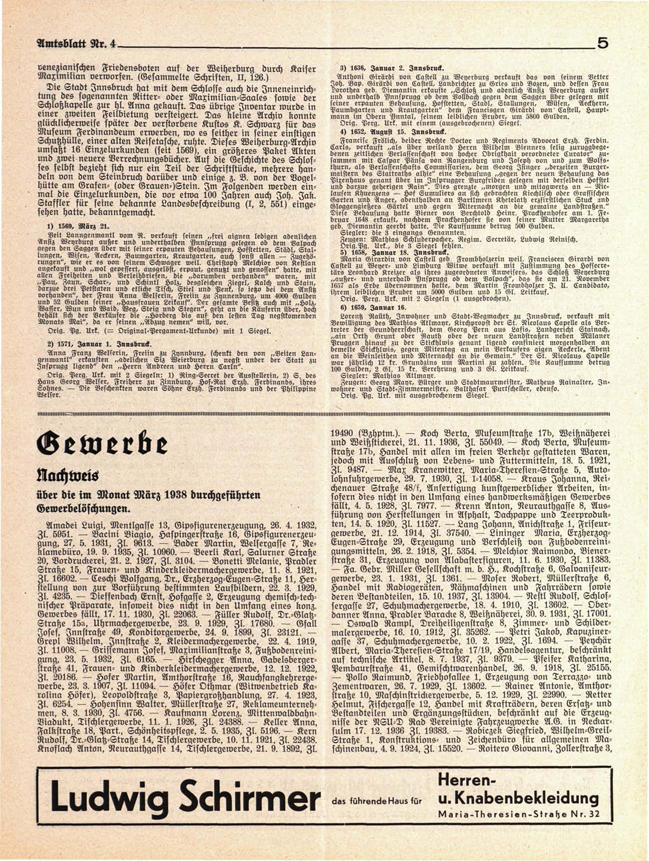 Zl. 9487. — Max Kranewitter. Maria-Theresien-Straße 5. Autolohnfuhrgewerbe. 29. 7. 1930, I I . I-14058. — Kraus Johanna, Reichenauer Straße 48/i, Anfertigung kunstgewerblicher Arbeiten, inüber die im Monat März 1938 durchgeführten