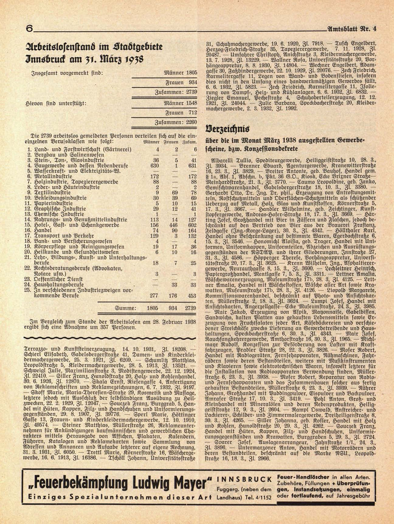 Rauchfangkehrergewerbe, Amthorstraße 16, 30. 3., Zl. 1965. — Michlmayr Rudolf, Konzession zur Beförderung von Lasten mit Kraftfahrzeugen, Pradler Straße 28, 22. 3., Zl. 3826. — Moser Robert,