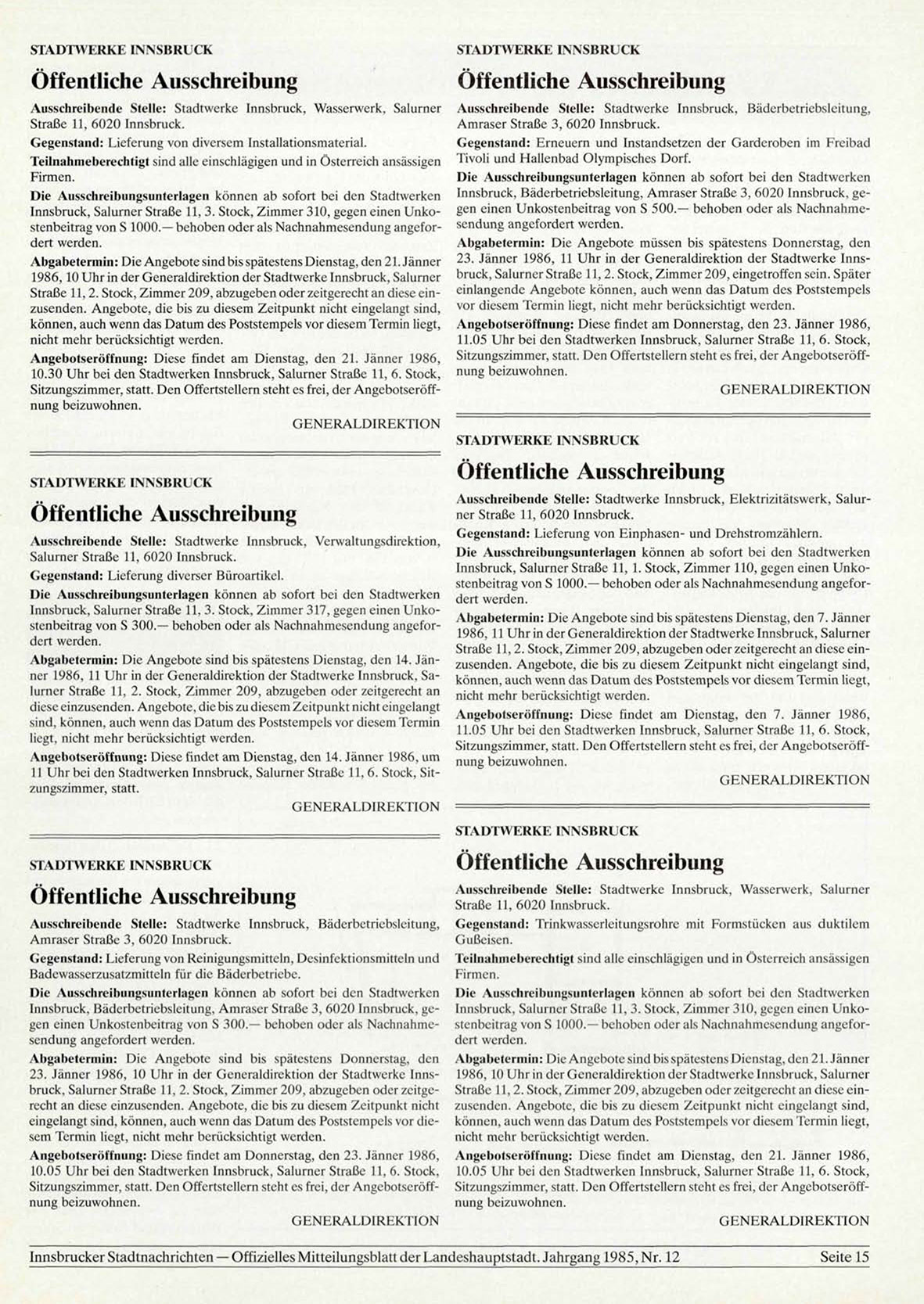 23. Jänner 1986, 10 Uhr in der Gcncraldircktion der Stadtwerke Innsbruck, Salurner Straße 11, 2. Stock, Zimmer 209, abzugeben oder zeitgerecht an diese einzusenden. Angebote, die bis zu diesem Zeitpunkt nicht