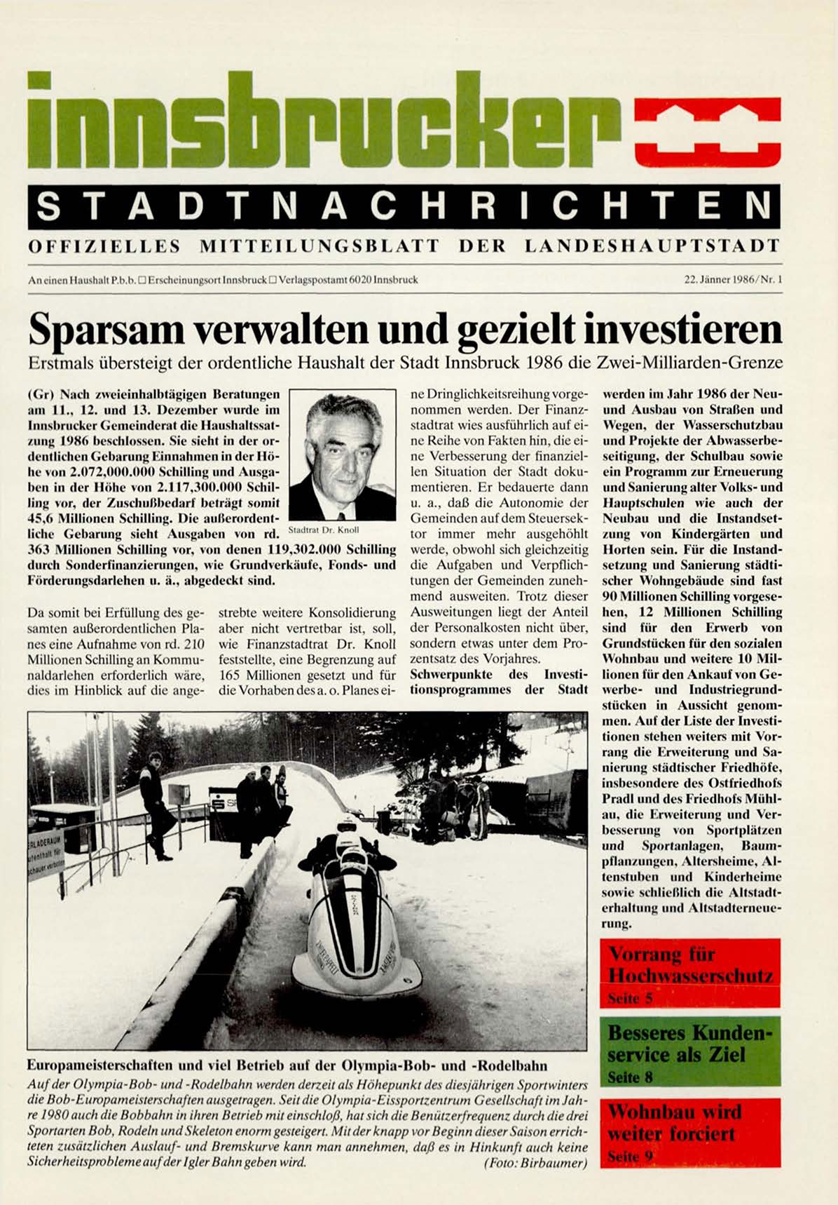 Erstmals übersteigt der ordentliche Haushalt der Stadt Innsbruck 1986 die Zwei-Milliarden-Grenze