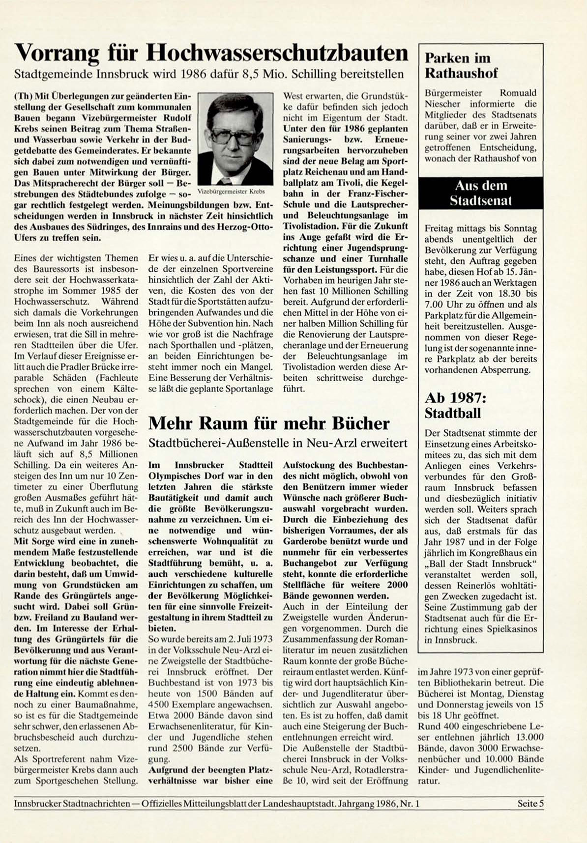 Innsbrucker Stadtnachrichten — Offizielles Mitteilungsblatt der Landeshauptstadt. Jahrgang 1986, N r . 1