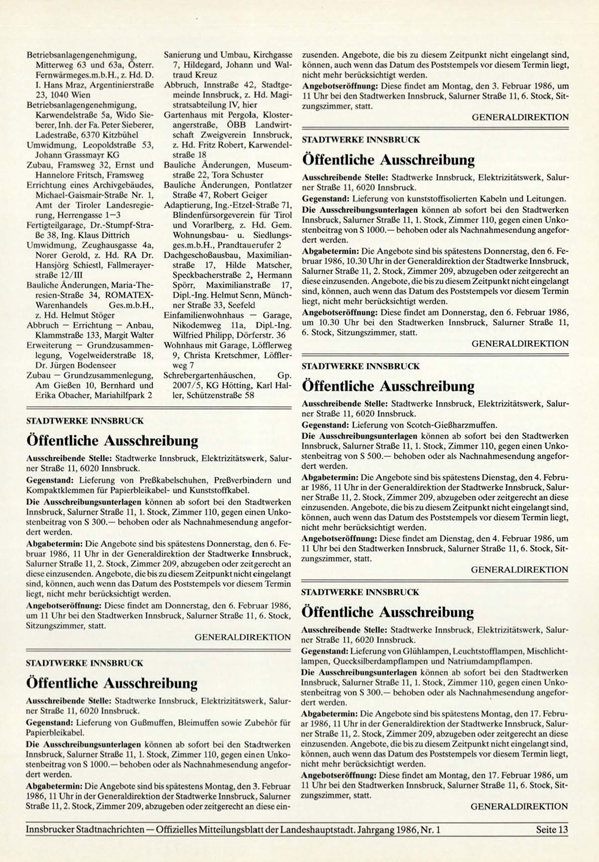 Innsbrucker Stadtnachrichten — Offizielles Mitteilungsblatt der Landeshauptstadt. Jahrgang 1986, Nr. 1