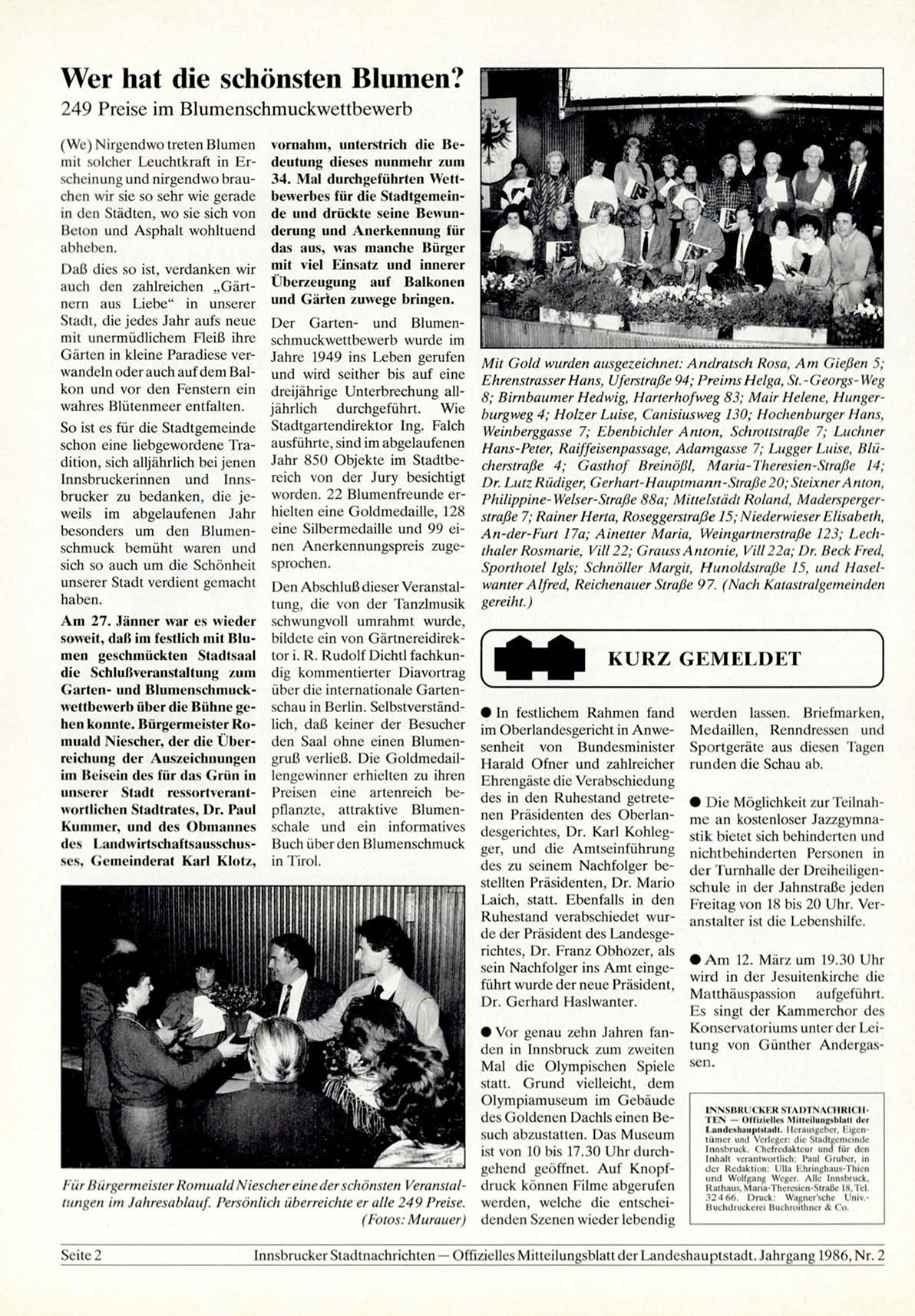 Innsbrucker Stadtnachrichten — Offizielles Mitteilungsblatt der Landeshauptstadt. Jahrgang 1986, Nr. 2