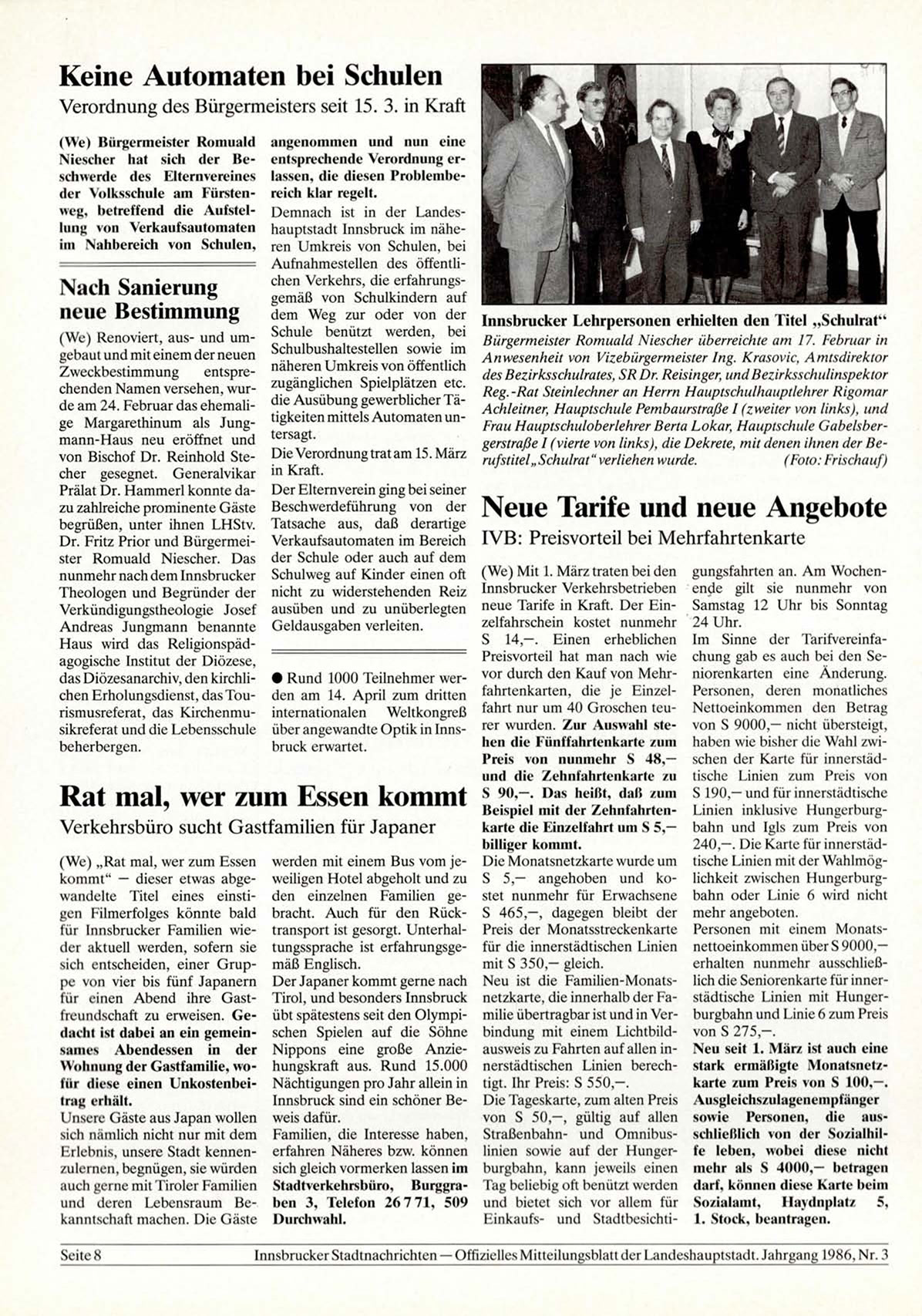 I nnsbrucker Stadtnachrichten — Offizielles Mitteilungsblatt der Landeshauptstadt. Jahrgang 1986, Nr. 3