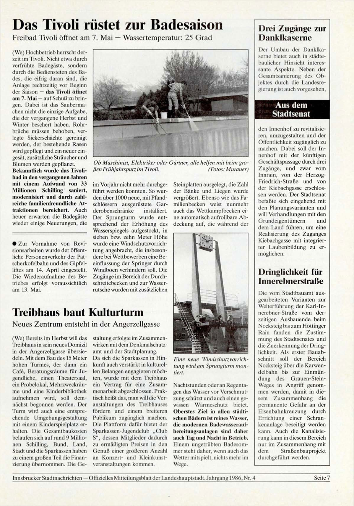 Innsbrucker Stadtnachrichten — Offizielles Mitteilungsblatt der Landeshauptstadt. Jahrgang 1986, Nr. 4
