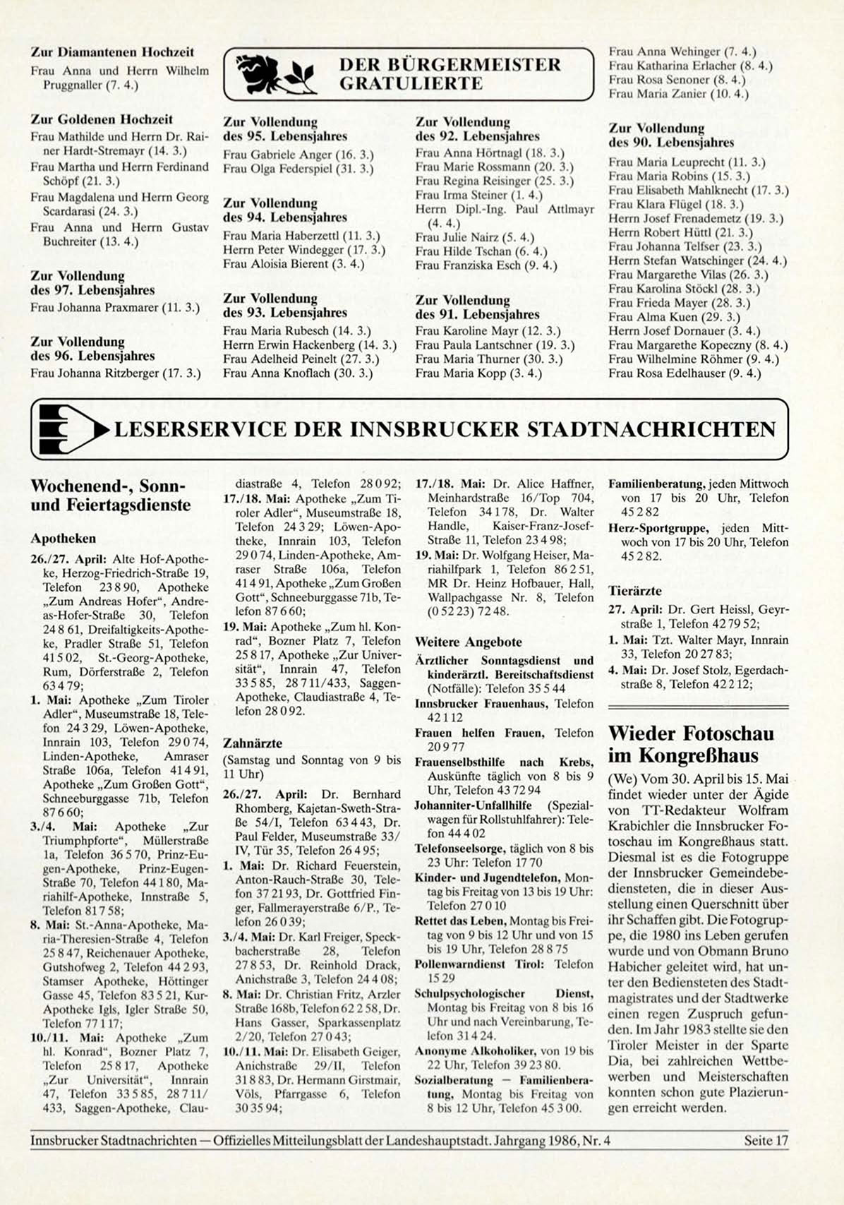 Innsbrucker Stadtnachrichten — Offizielles Mitteilungsblatt der Landeshauptstadt. Jahrgang 1986, Nr. 4