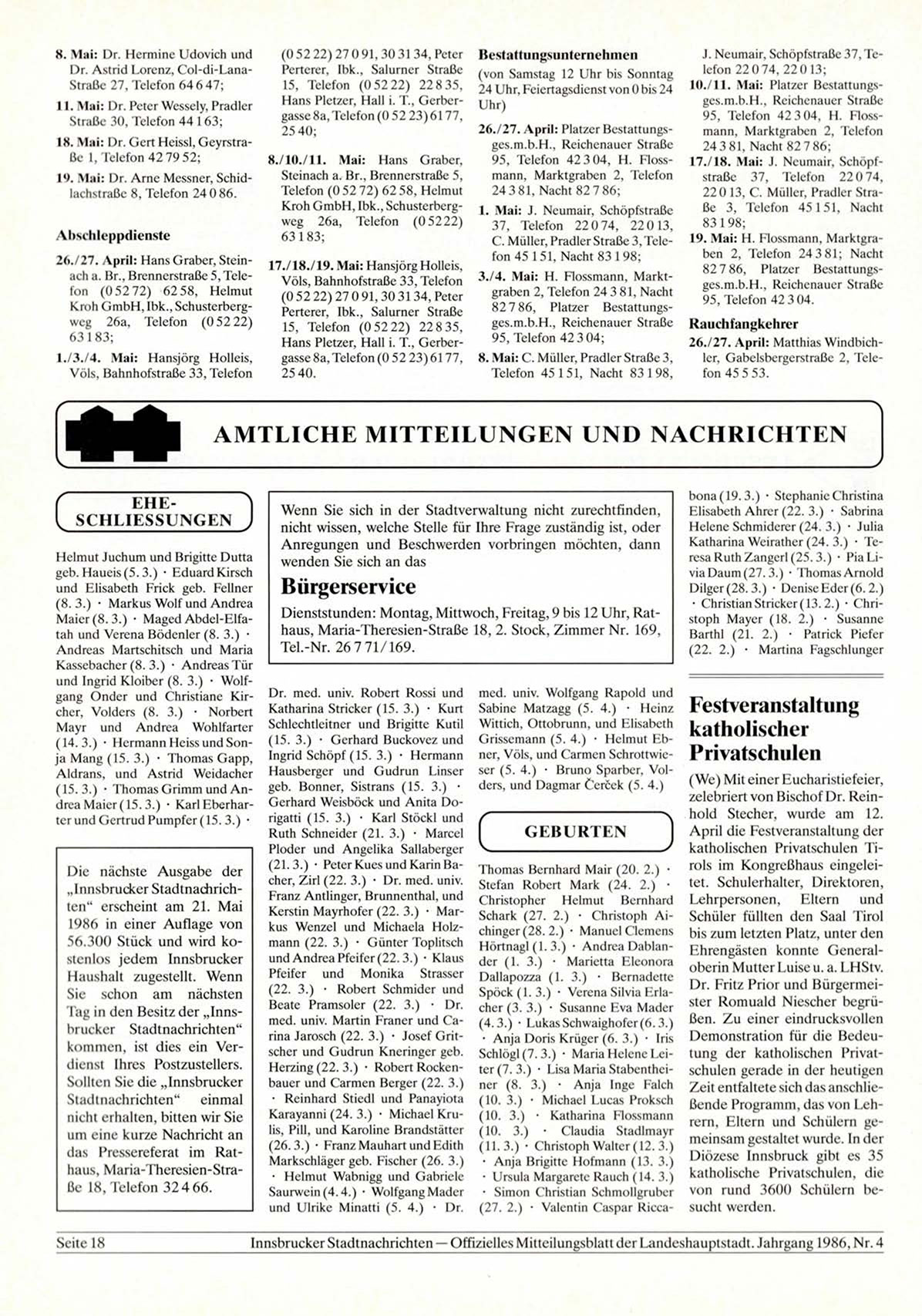 I n n s b r u c k e r S t a d t n a c h r i c h t e n — O f f i z i e l l e s M i t t e i l u n g s b l a t t d e r L a n d e s h a u p t s t a d t . J a h r g a n g 1986, N r . 4
