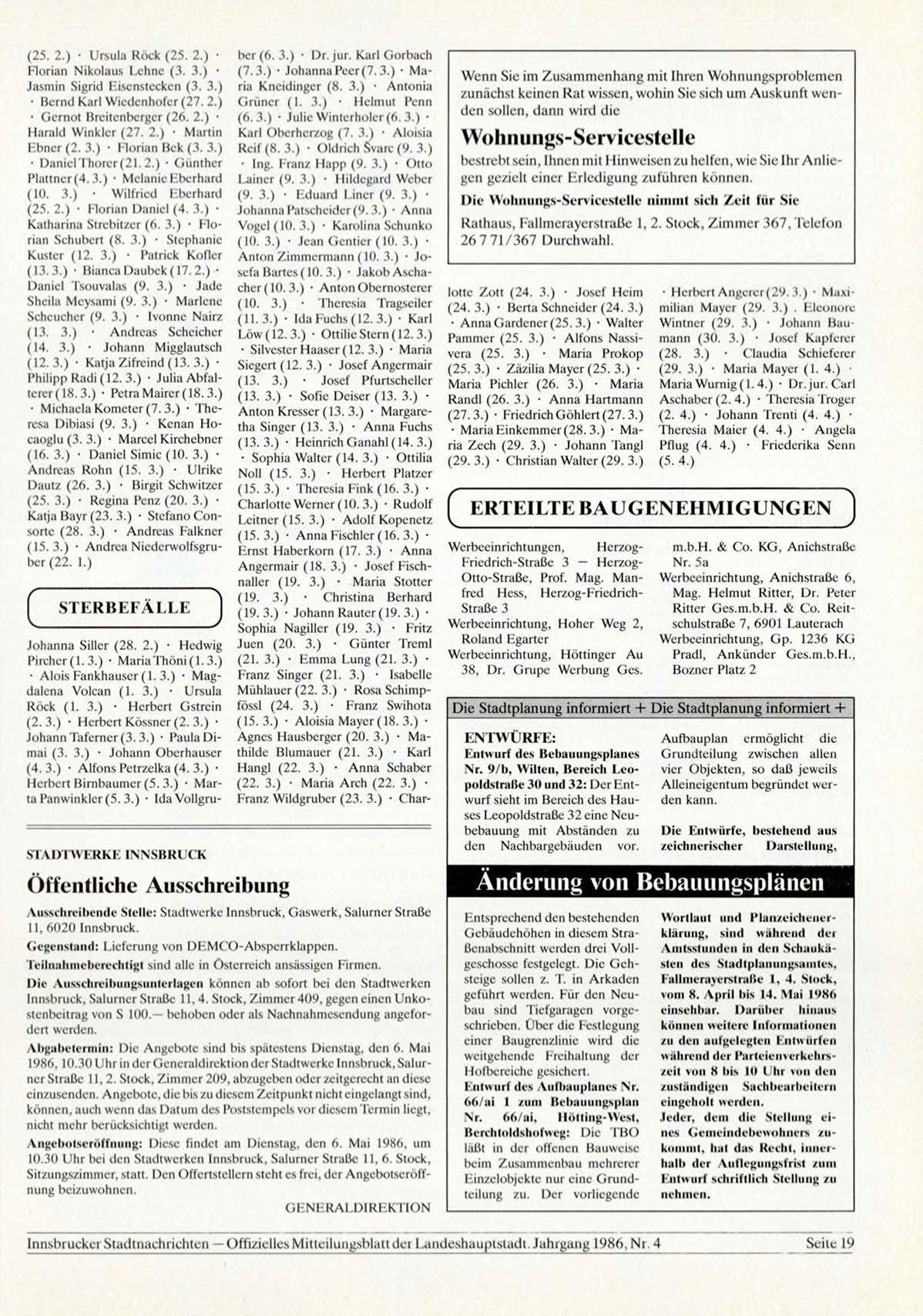 Lnnsbrucker Stadtnachrichten - Offizielles Mitteilungsblatt der Landeshauptstadt. Jahrgang 1986, Nr. 4