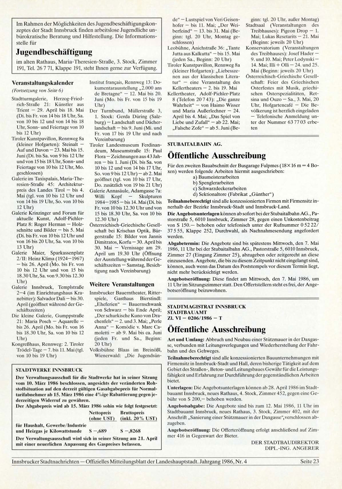 Innsbrucker Stadtnachrichten — Offizielles Mitteilungsblatt der Landeshauptstadt. Jahrgang 1986, Nr. 4