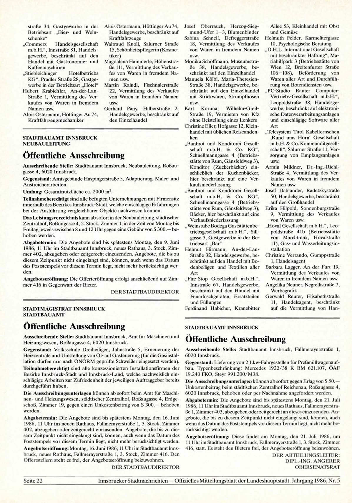 Innsbrucker Stadtnachrichten — Offizielles Mitteilungsblatt der Landeshauptstadt. Jahrgang 1986, Nr. 5