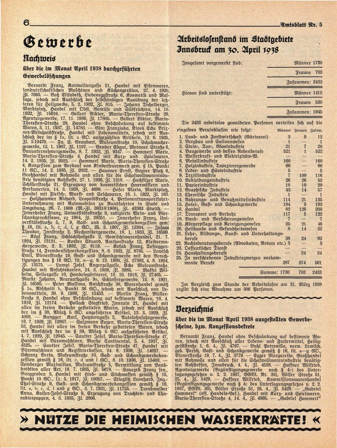Agenturgewerbe. 17. 11. 1936. I l , 17805. — Gellert Viktor. MariaDie 2433 arbeitslos gemeldeten Personen Verteiler l sich auf die