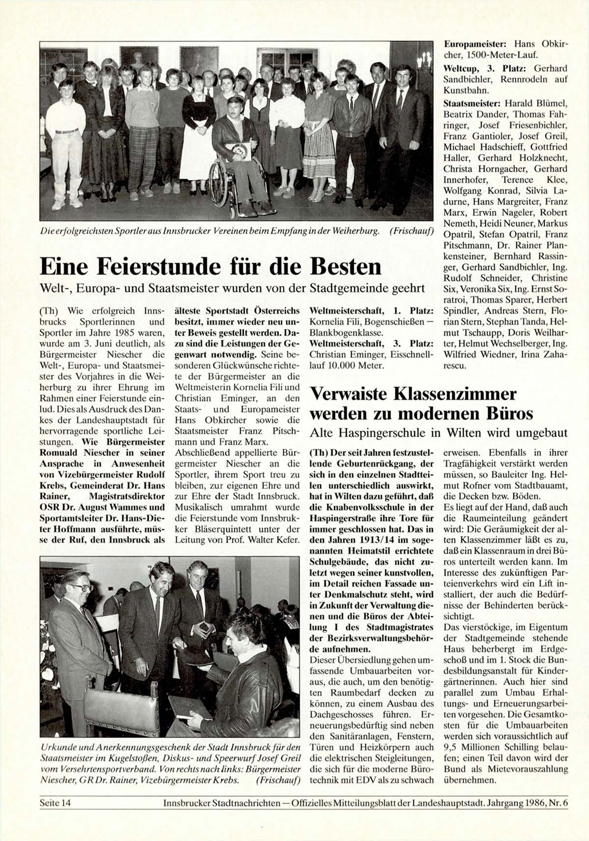 Innsbrucker Stadtnachrichten — Offizielles Mitteilungsblatt der Landeshauptstadt. Jahrgang 1986, Nr. 6