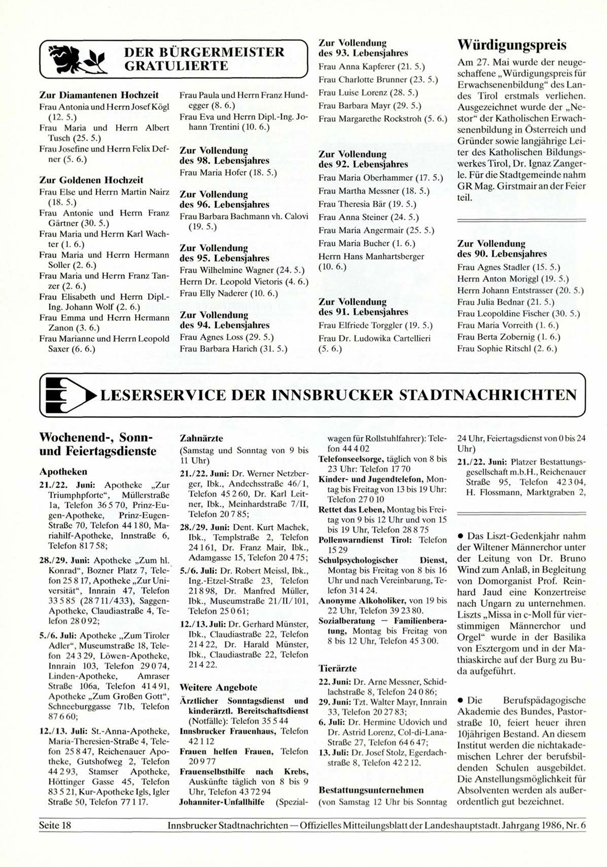 Innsbrucker Stadt nachrichten — Offizielles Mitteilungsblatt der Landeshauptstadt. Jahrgang 1986, Nr. 6