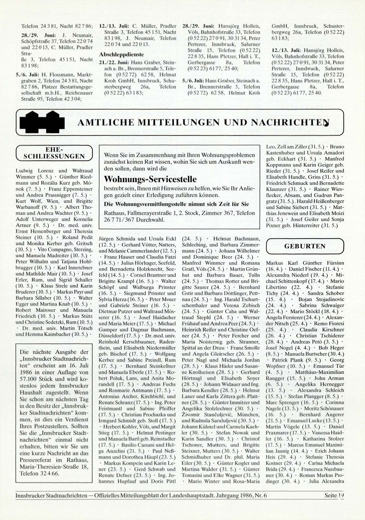 Innsbrucker Stadtnachrichten — Offizielles Mitteilungsblatt der Landeshauptstadt. Jahrgang 1986, Nr. 6