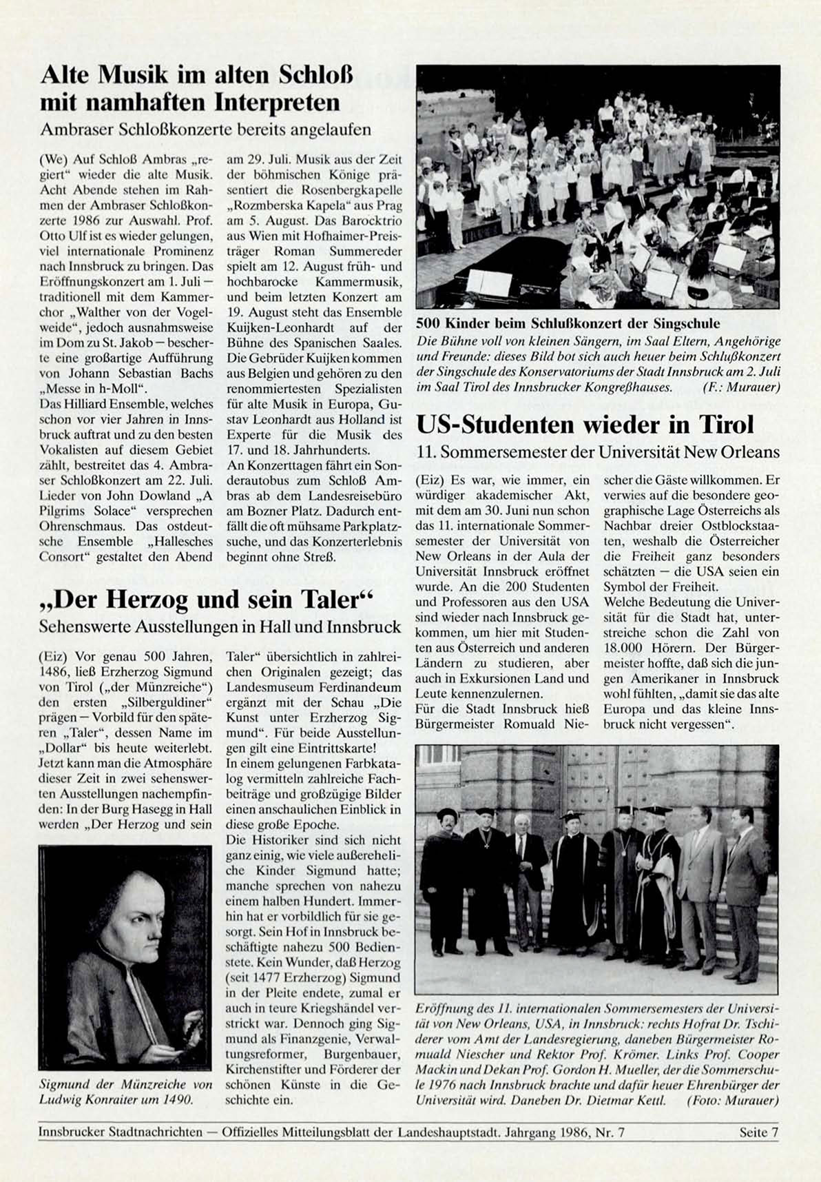 I n n s b r u c k e r S t a d t n a c h r i c h t e n — O f f i z i e l l e s M i t t e i l u n g s b l a t t d e r L a n d e s h a u p t s t a d t . J a h r g a n g 1986, N r . 7