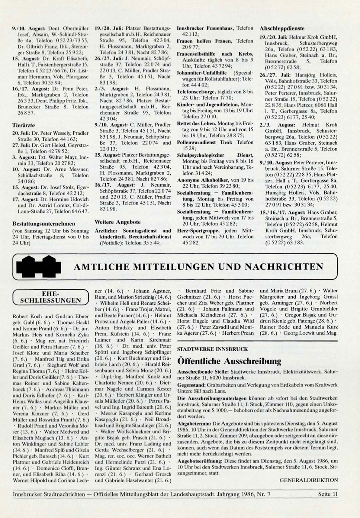 Innsbrucker Stadtnachrichten — Offizielles Mitteilungsblatt der Landeshauptstadt. Jahrgang 1986, Nr. 7