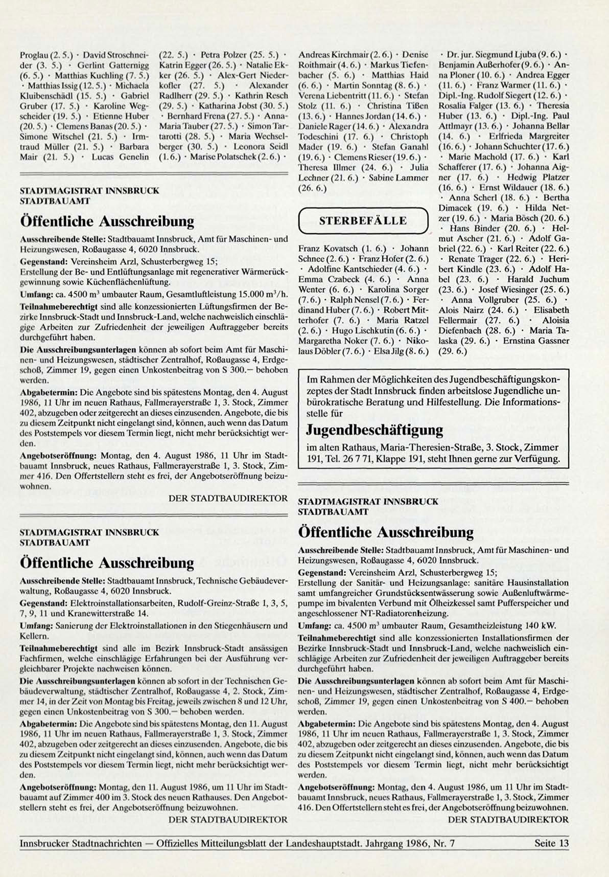 • Hans Binder (20. 6.) • H e l mut Ascher (21. 6.) • A d o l f G a Ausschreibende Stelle: Stadtbauamt Innsbruck, A m t für Maschinen- und