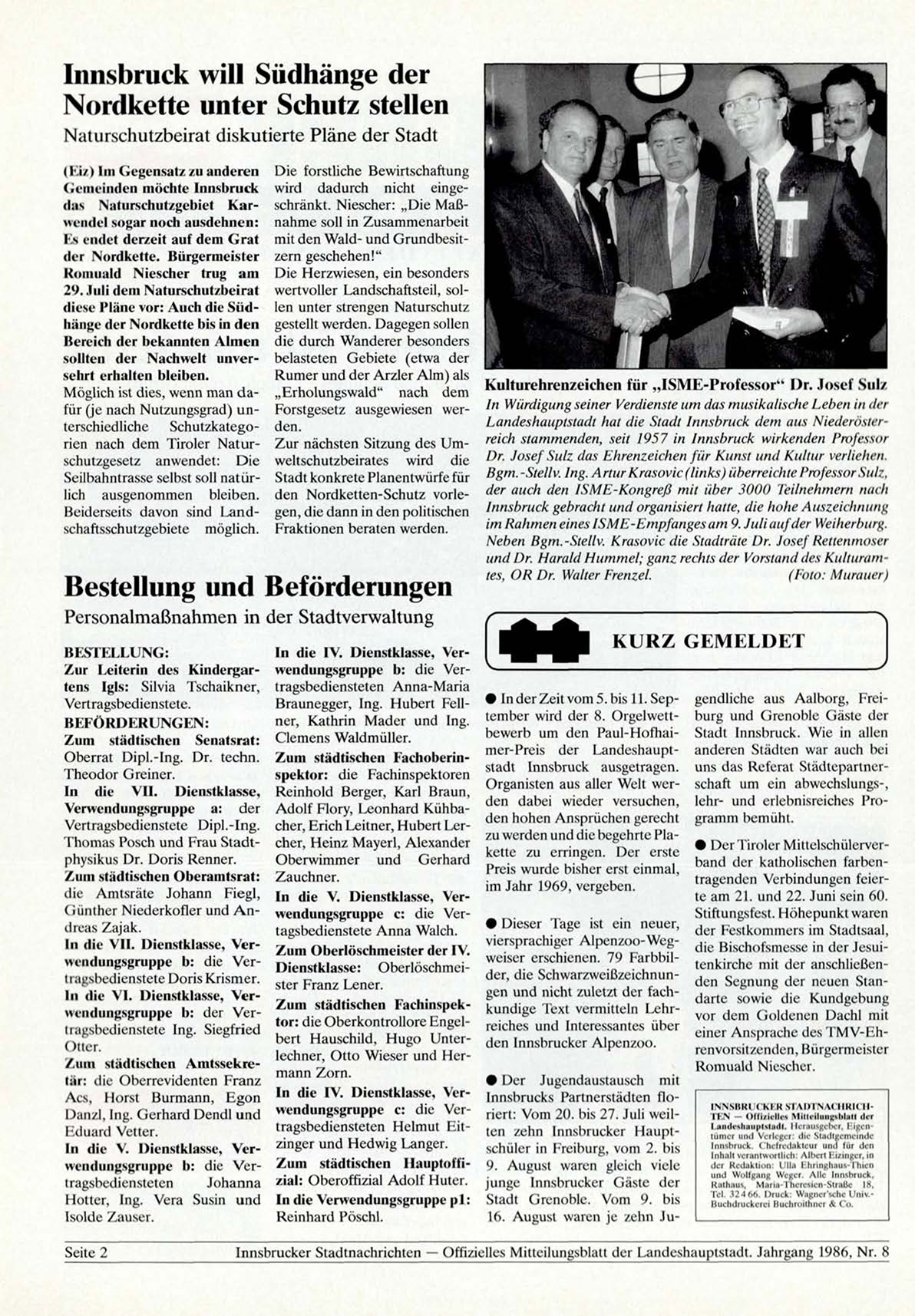 Innsbrucker Stadtnachrichten — Offizielles Mitteilungsblatt der Landeshauptstadt. Jahrgang 1986, Nr. 8
