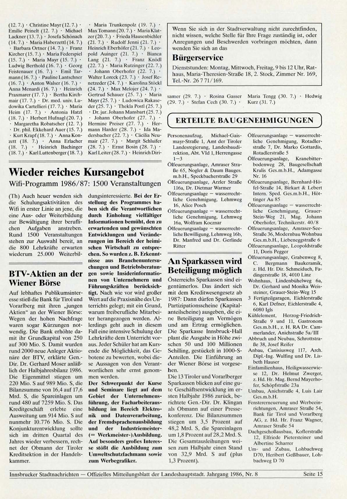 Innsbrucker Stadtnachrichten — Offizielles Mitteilungsblatt der Landeshauptstadt. Jahrgang 1986, Nr. 8
