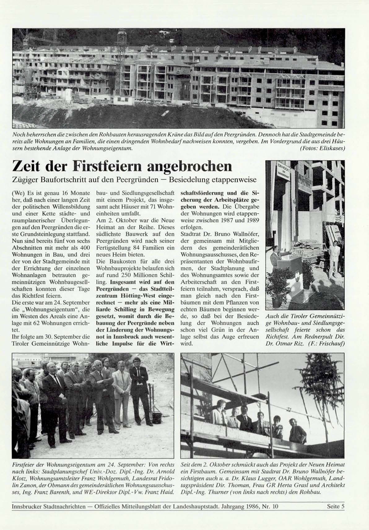 beherrschen die zwischen den Rohbauten herausragenden Kräne das Bild auf den Peergründen. Dennoch hat die Stadtgemeinde bereits alle Wohnungen an Familien, die einen dringenden Wohnbedarf nachweisen konnten, vergeben. Im Vordergrund die aus drei Häusern bestehende Anlage der Wohnungseigentum.
