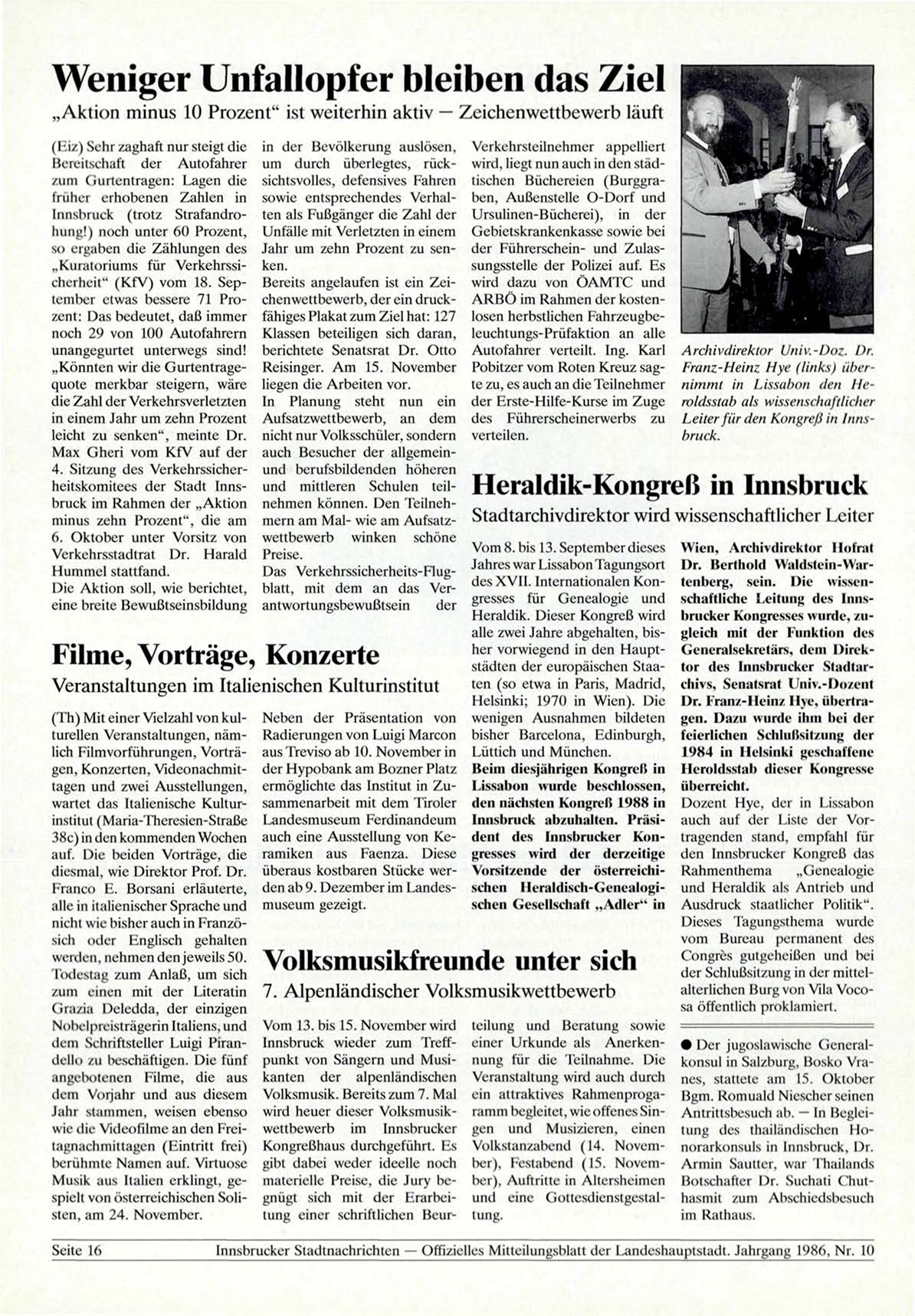 Innsbrucker Stadtnachrichten — Offizielles Mitteilungsblatt der Landeshauptstadt. Jahrgang 1986, Nr. 10