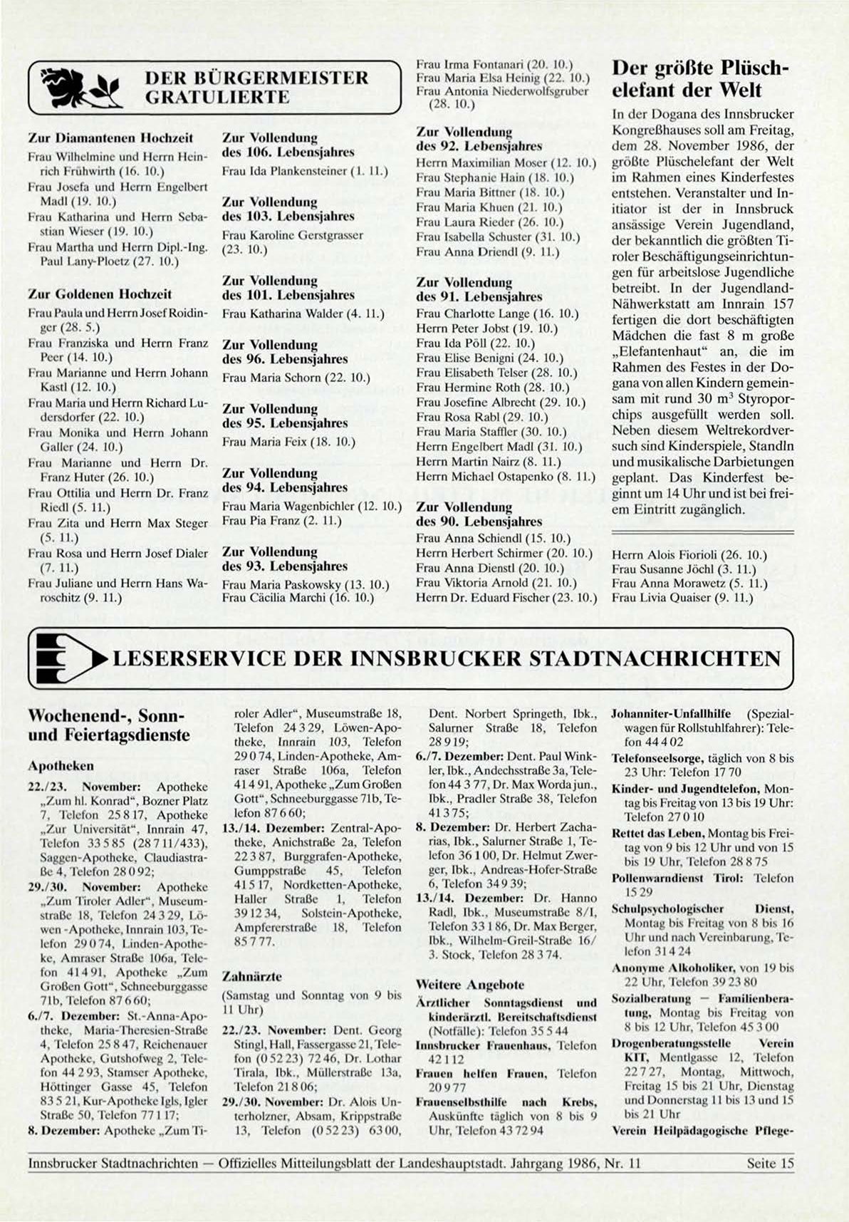 Innsbrucker Stadtnachrichten — Offizielles Mitteilungsblatt der Landeshauptstadt. Jahrgang 1986, Nr. 11