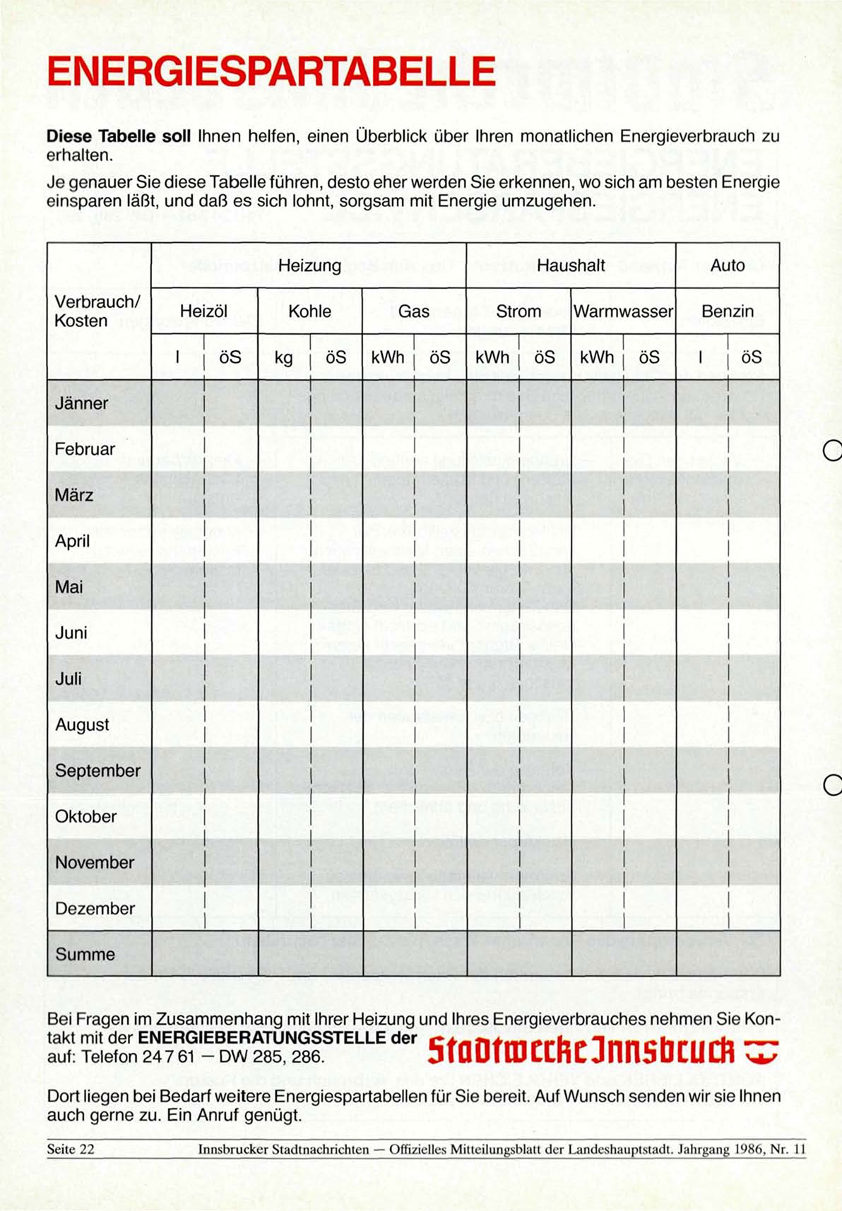 Diese Tabelle soll Ihnen helfen, einen Überblick über Ihren monatlichen Energieverbrauch zu