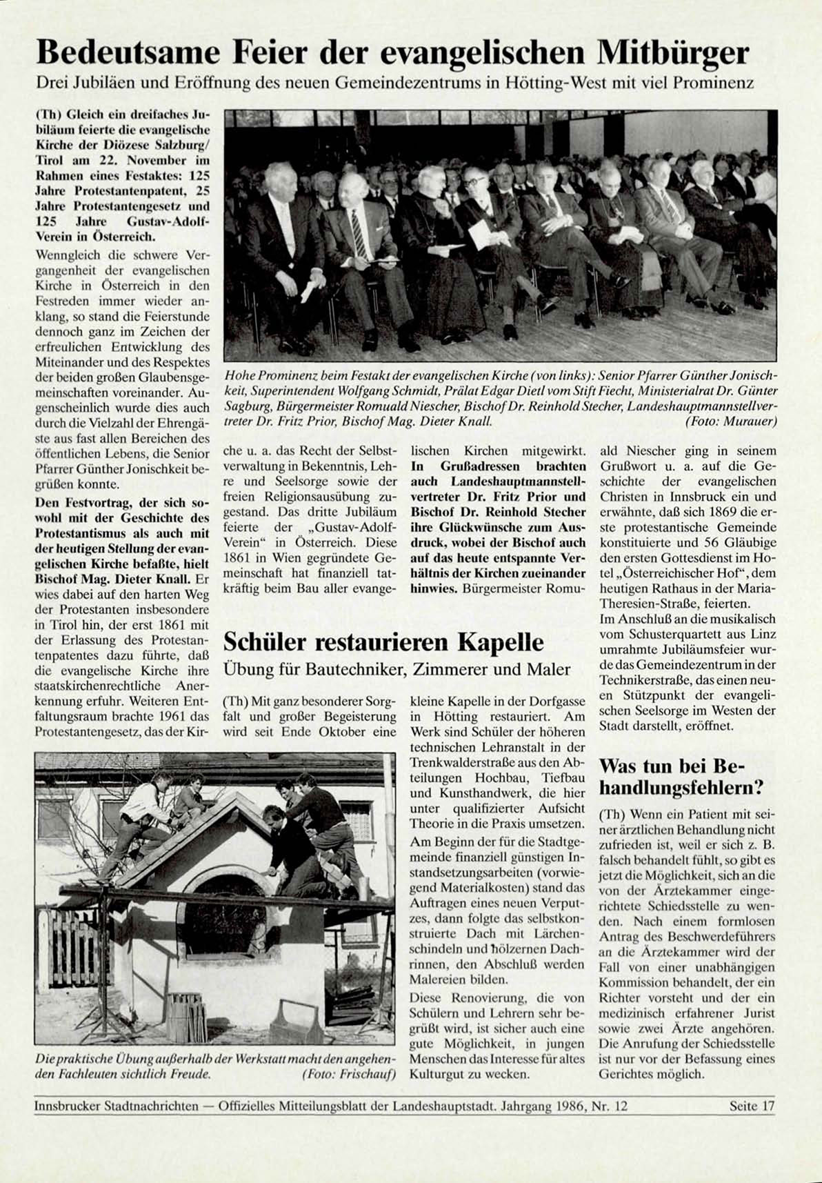 Innsbrucker Stadtnachrichten — Offizielles Mitteilungsblatt der Landeshauptstadt. Jahrgang 1986, Nr. 12