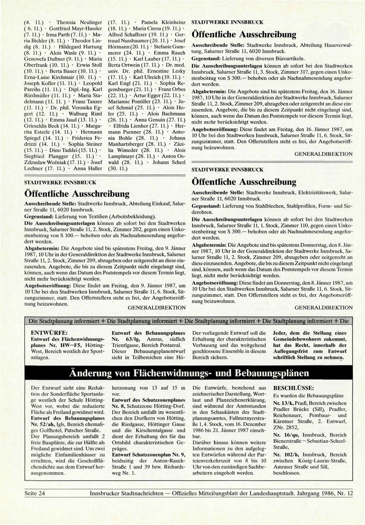 Innsbrucker Stadtnachrichten — Offizielles Mitteilungsblatt der Landeshauptstadt. Jahrgang 1986, Nr. 12