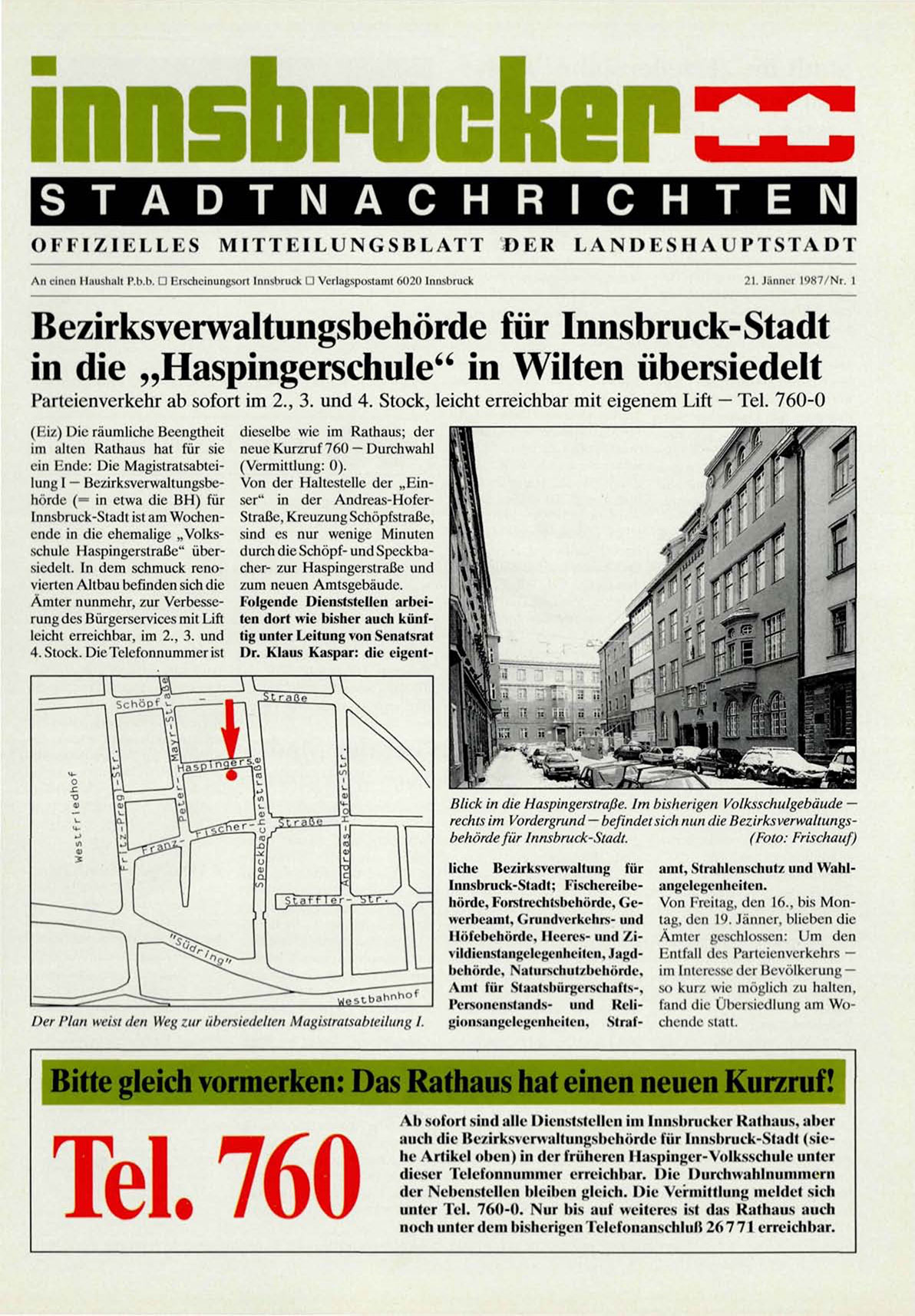 auch die lie/irksvervaltungsbehöide lui Innsbruck-Stadt (siehe Artikel oben) in der früheren Maspinger-Volksschule unter