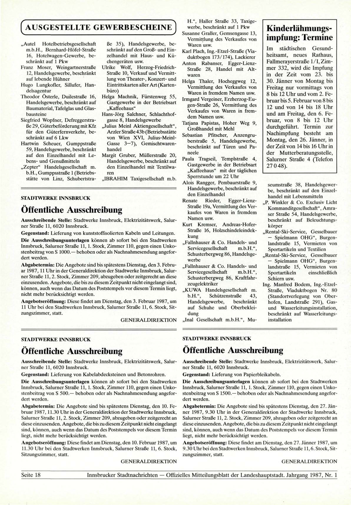 Innsbrucker Stadtnachrichten — Offizielles Mitteilungsblatt der Landeshauptstadt. Jahrgang 1987, Nr. 1