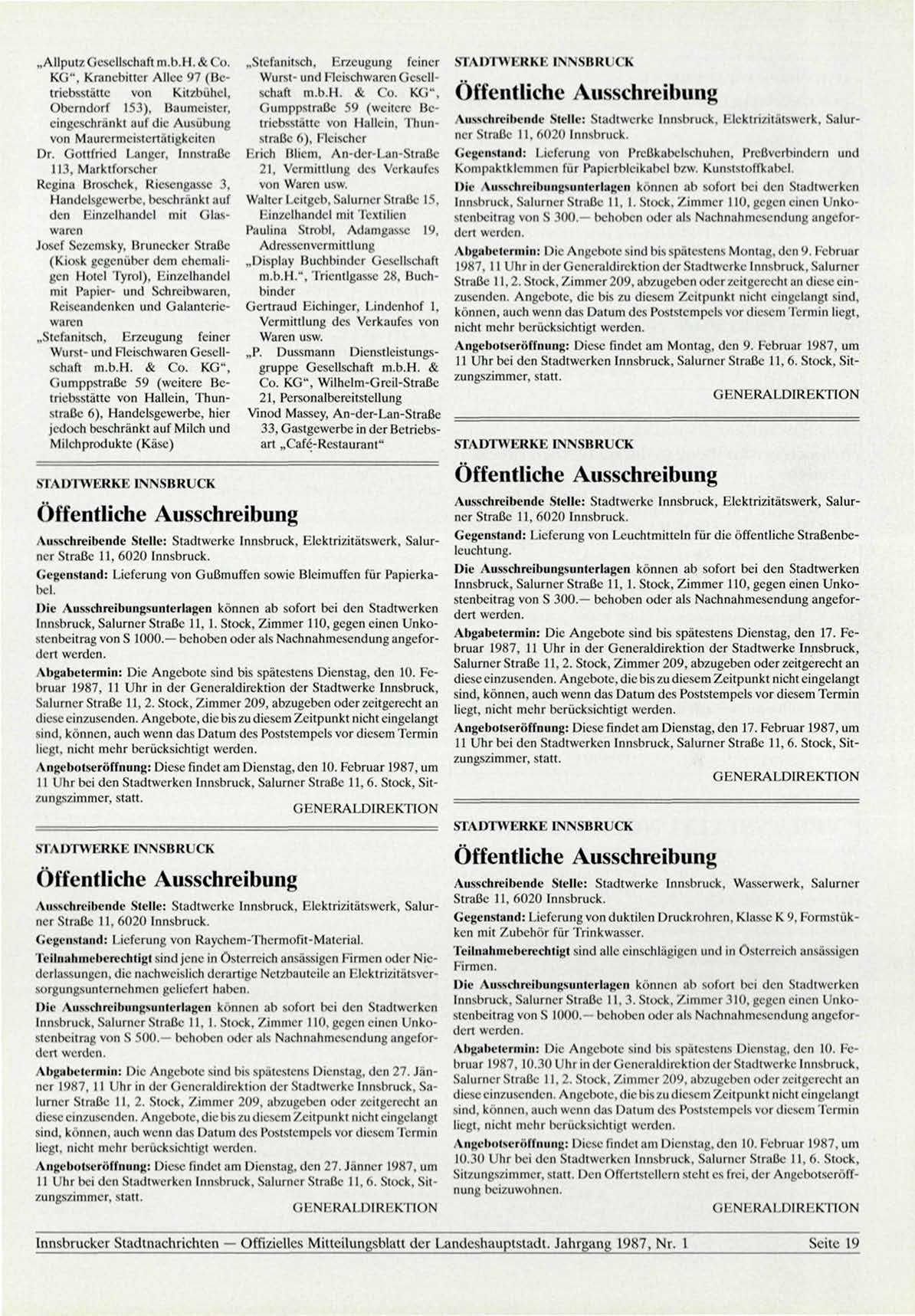 Innsbrucker Stadtnachrichten — Offizielles Mitteilungsblatt der Landeshauptstadt. Jahrgang 1987, Nr. 1