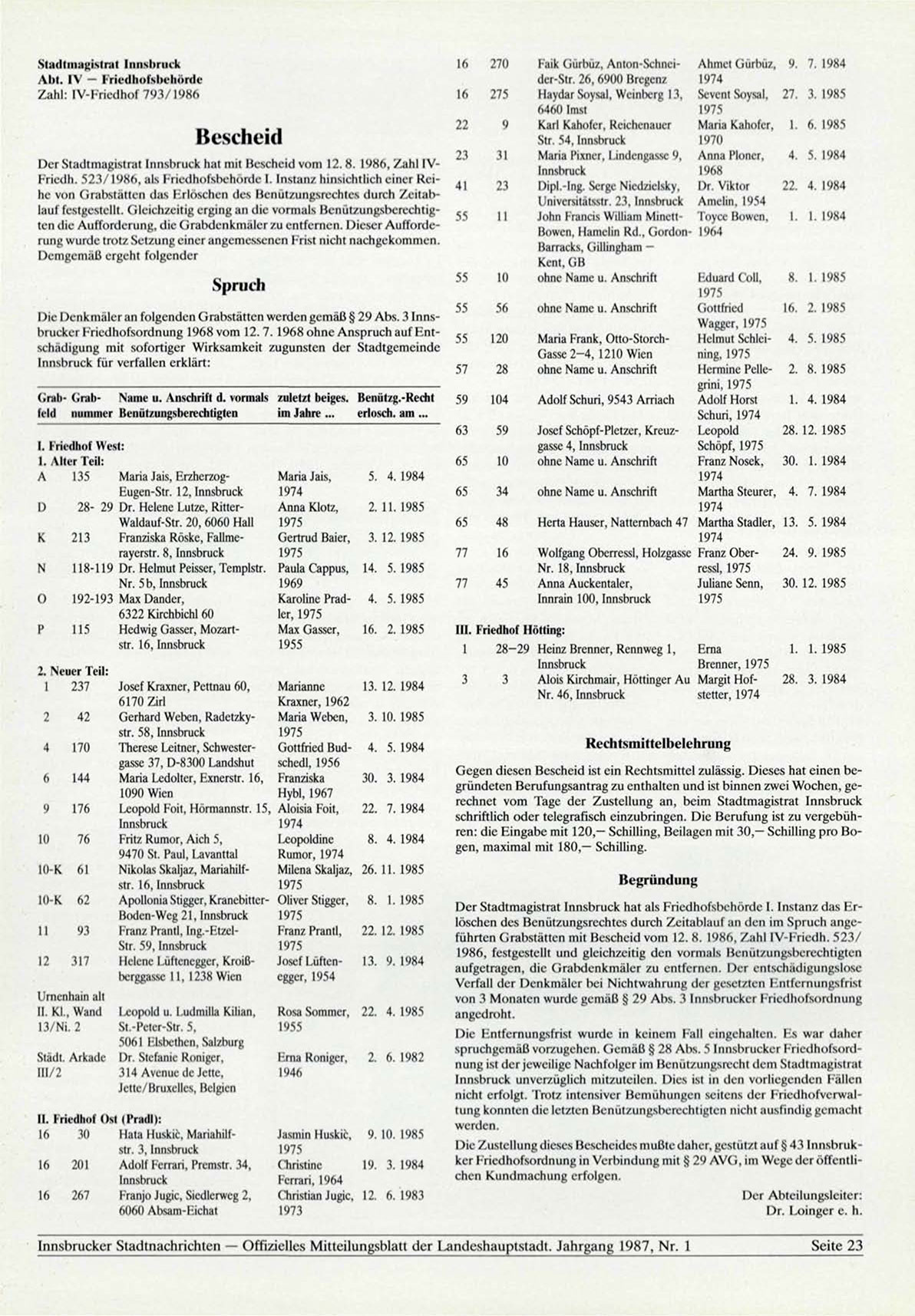 Der Stadtmagistrat Innsbruck hat als Friedhofsbehörde I. Instanz das Erlöschen des Benutzungsrechtes durch Zcitablauf an den im Spruch angeführten Grabstätten mit Bescheid vom 12. 8. 1986, Zahl IV-Fricdh. 5 2 3 /