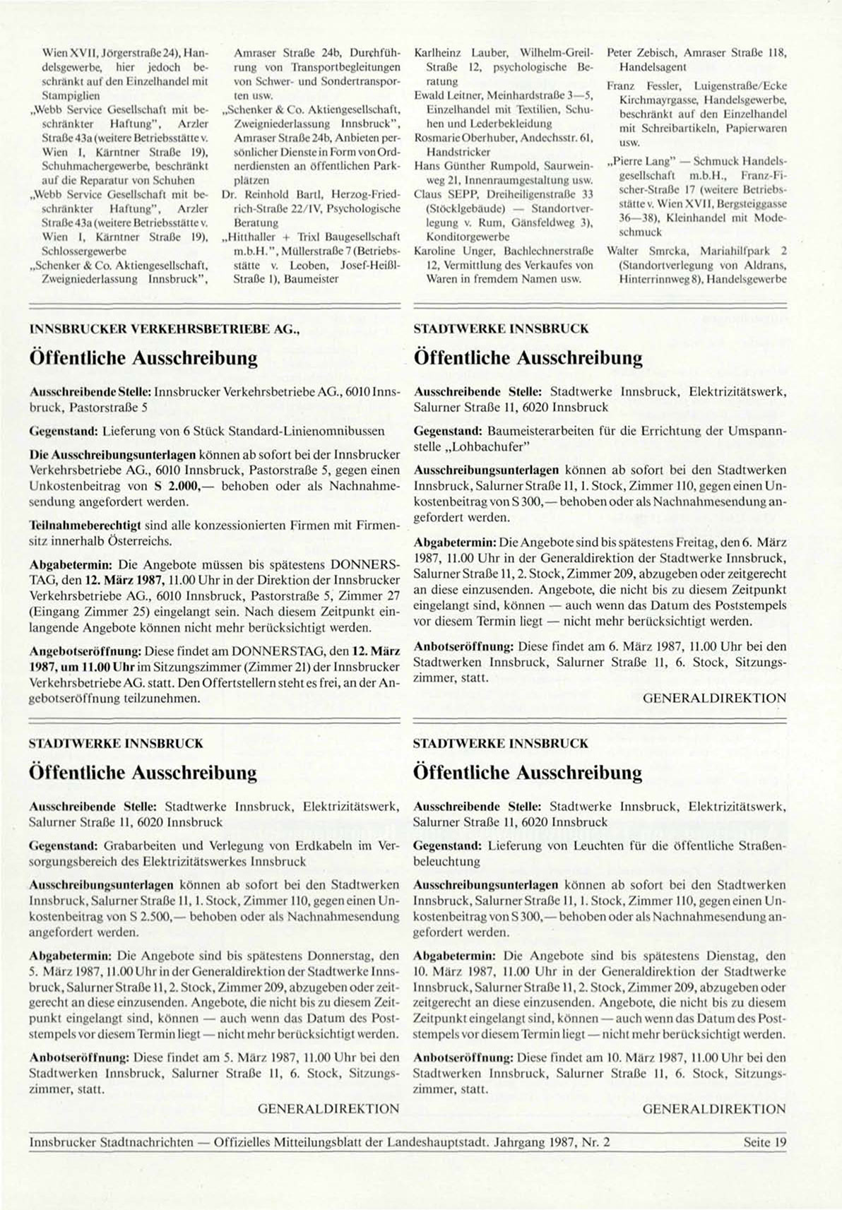 Innsbrucker Stadtnachrichten — Offizielles Mitteilungsblatt der Landeshauptstadt. Jahrgang 1987, Nr. 2