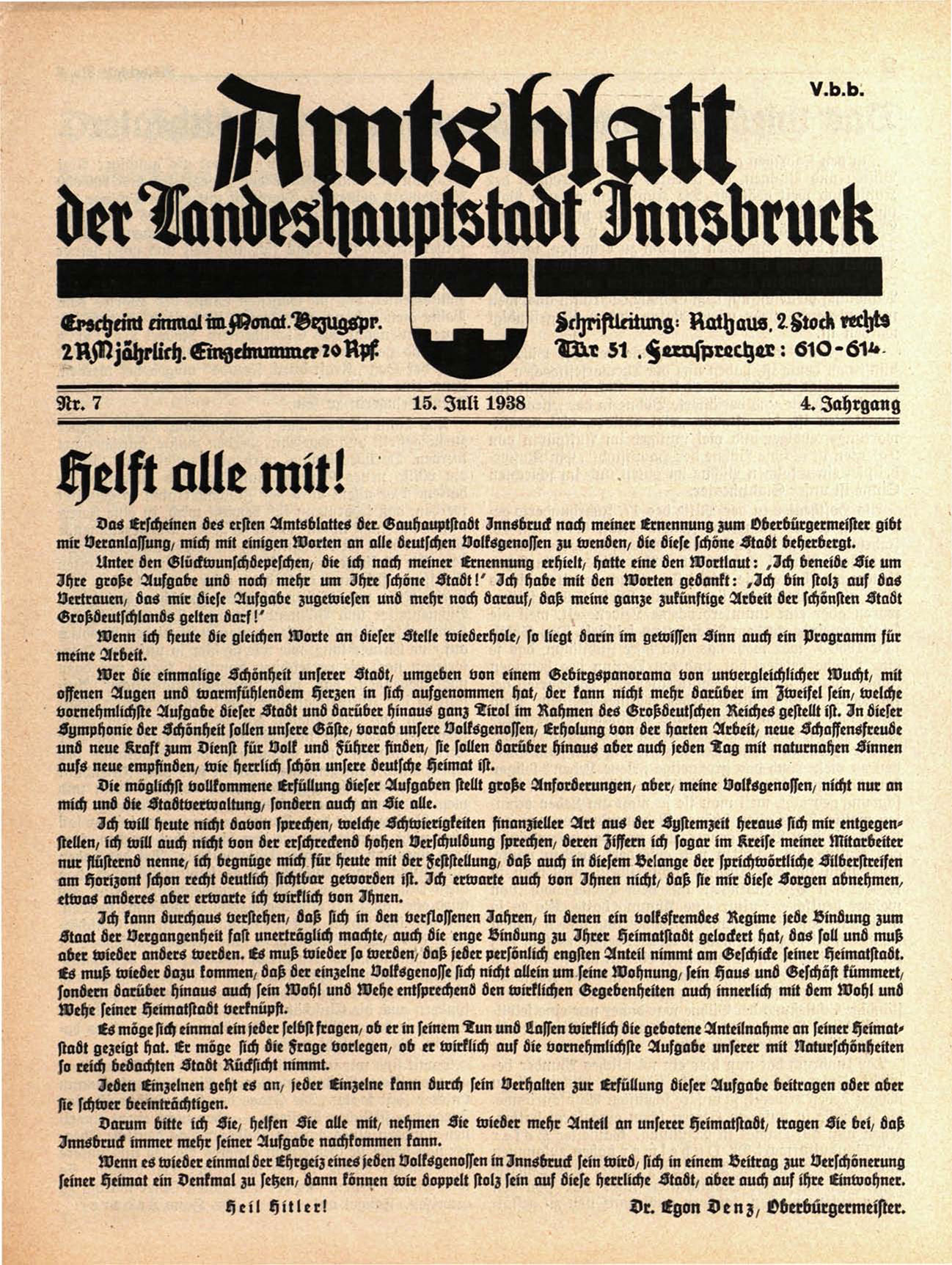 Das Erscheinen öes ersten Amtsblattes öer. Gauhauptstaöt Innsbruck nach meiner Ernennung zum Oberbürgermeister gibt