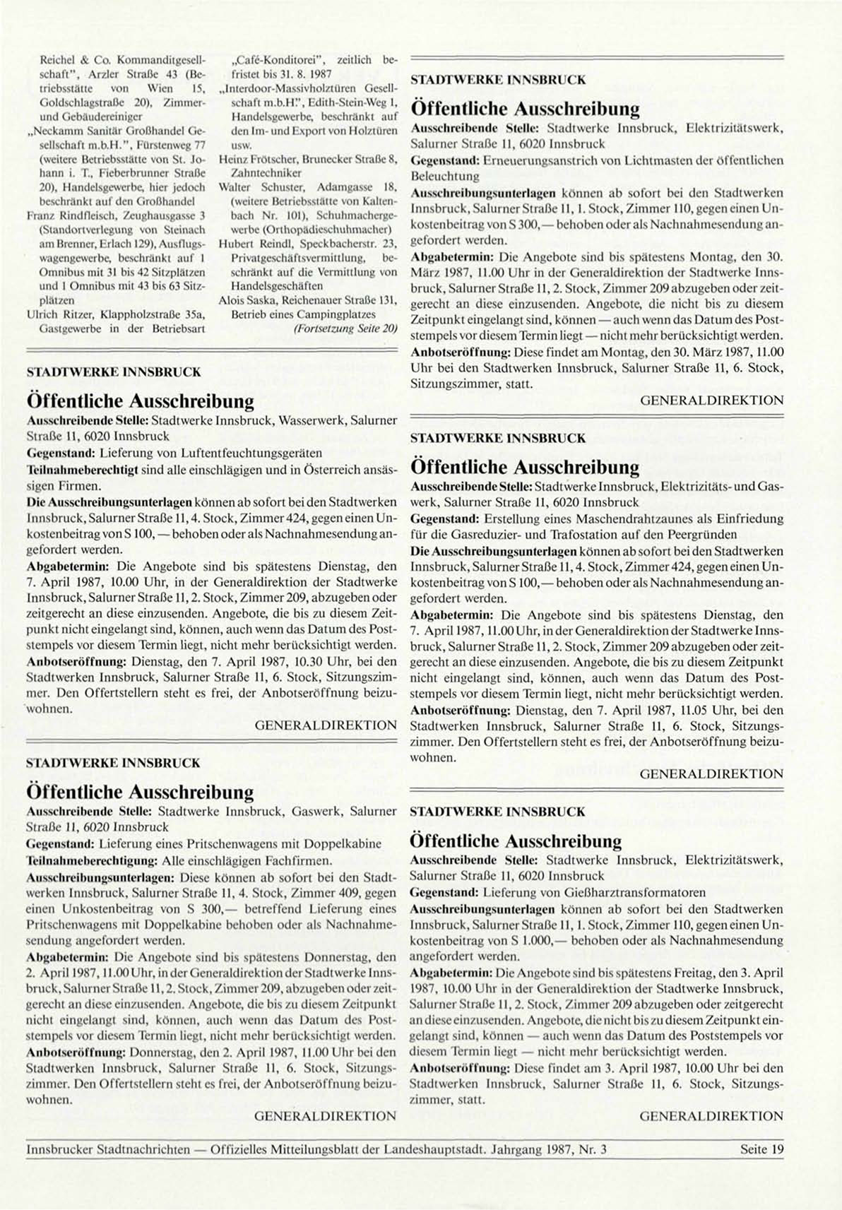 Innsbrucker Stadtnachrichten — Offizielles Mitteilungsblatt der Landeshauptstadt. Jahrgang 1987, Nr. 3