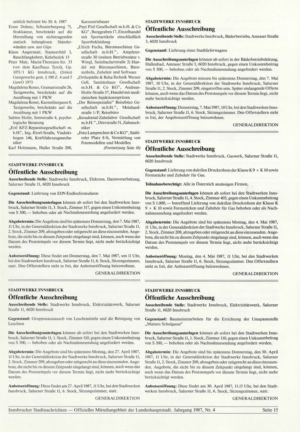 A nholsero liming: 1 )iese l"inda am 30. April 1987, 11.15 Uhr, bei den Stadtwerken Innsbruck, .Salurner Snaße II, 6. Stock, Sitzungszimmer, statt.