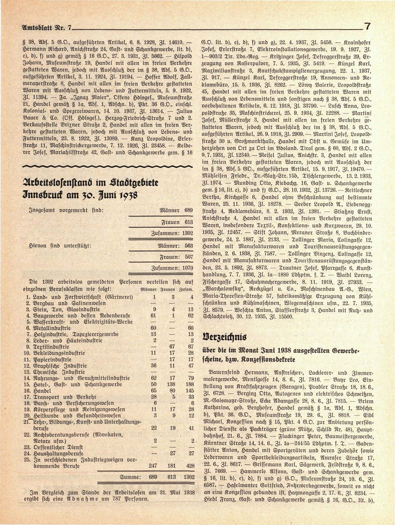 Vauernfeind Hermann, Anstreicher-, Lackierer- und Zimmermalergewerbe, Mentlgasse 14, 8. 6., Zl. 7816. — Banr Leo, Einstellung von Kraftfahrzeugen (Garagen), Pradler Straße 18, 18.6.,